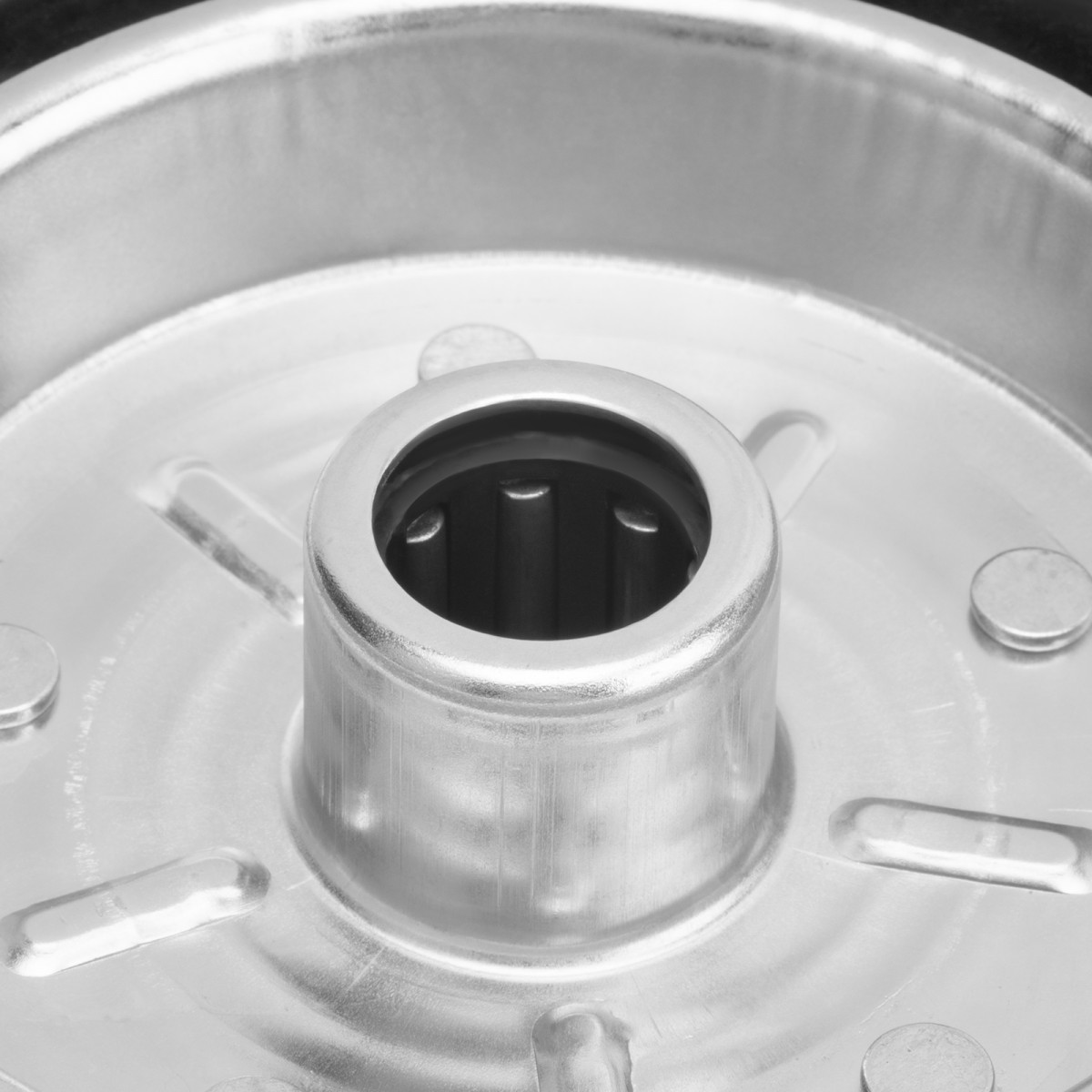 - Универсальность — контактная поверхность выполнена из прочной резины, поэтому колесо может применяться на различных покрытиях, долгое время сохраняя рабочие качества.