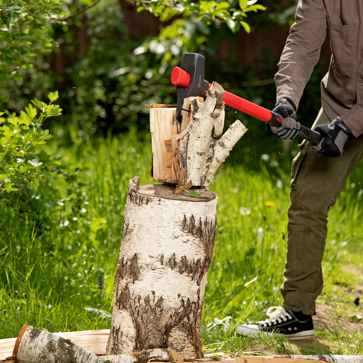 • Большая сила удара — колун оснащен длинной рукояткой 900 мм, полотно весит 3,6 кг.