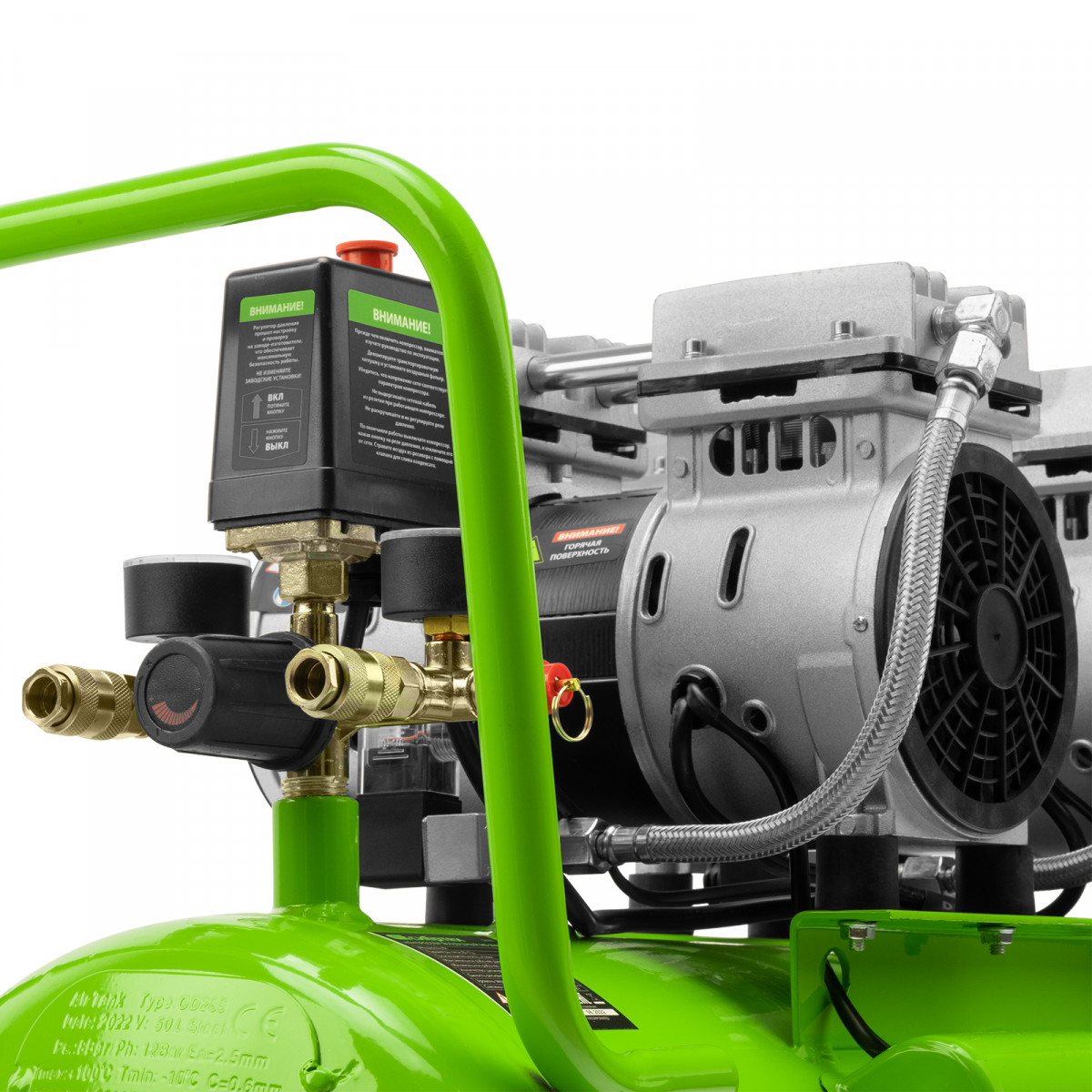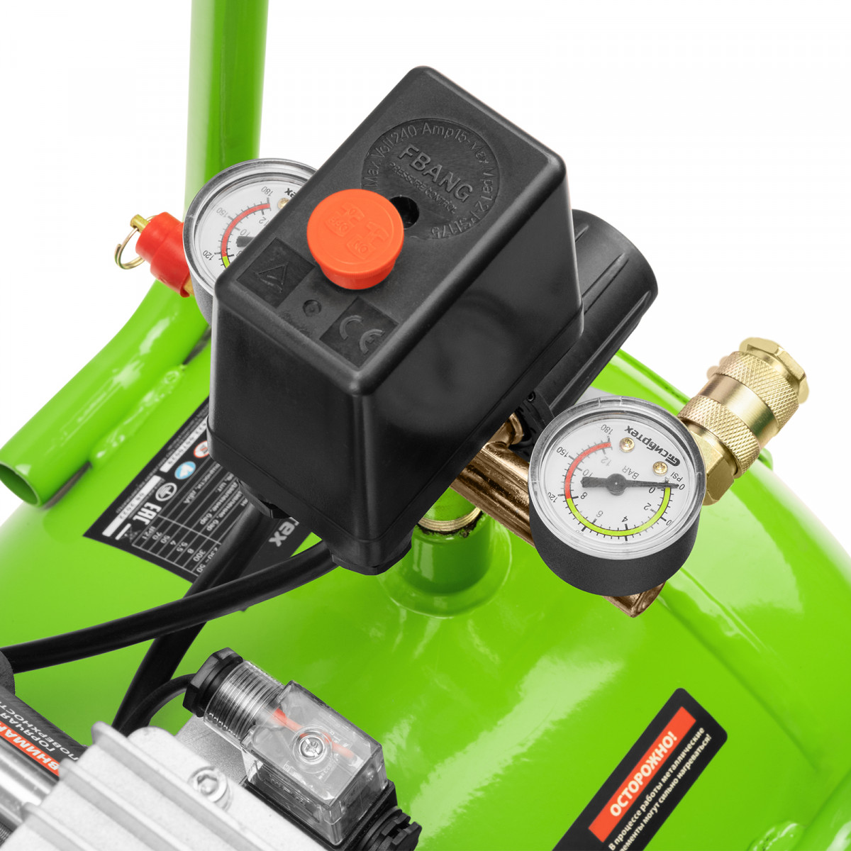• Контроль рабочих параметров — компрессор оборудован механическим манометром для отслеживания давления.