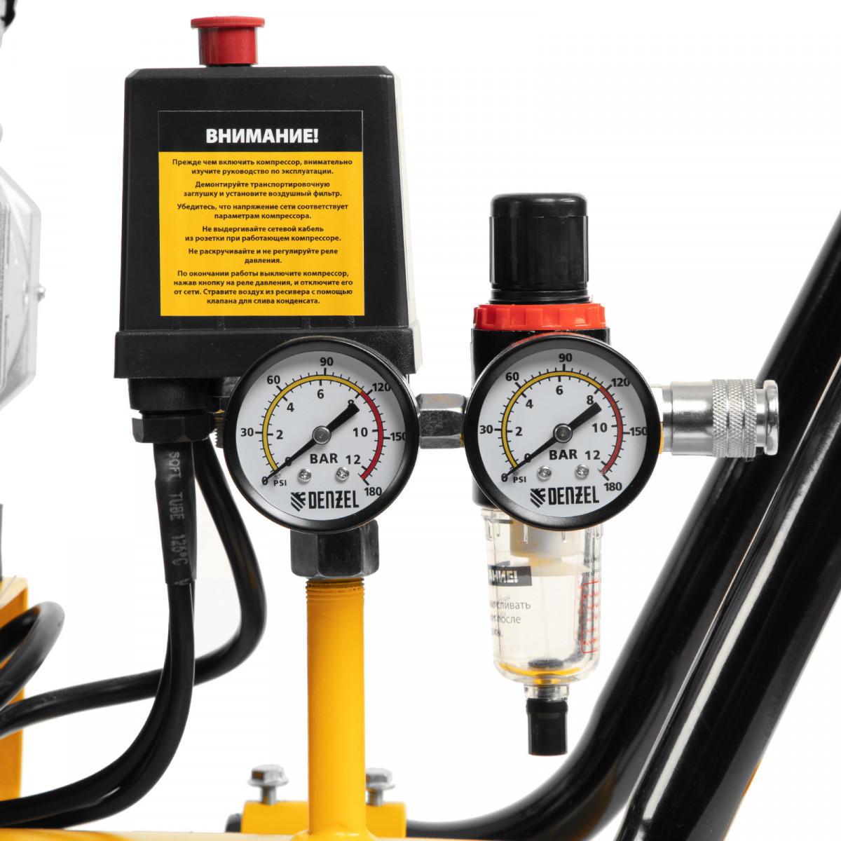 • Контроль давления в ресивере и на выходной магистрали — компрессор оборудован двумя манометрами.