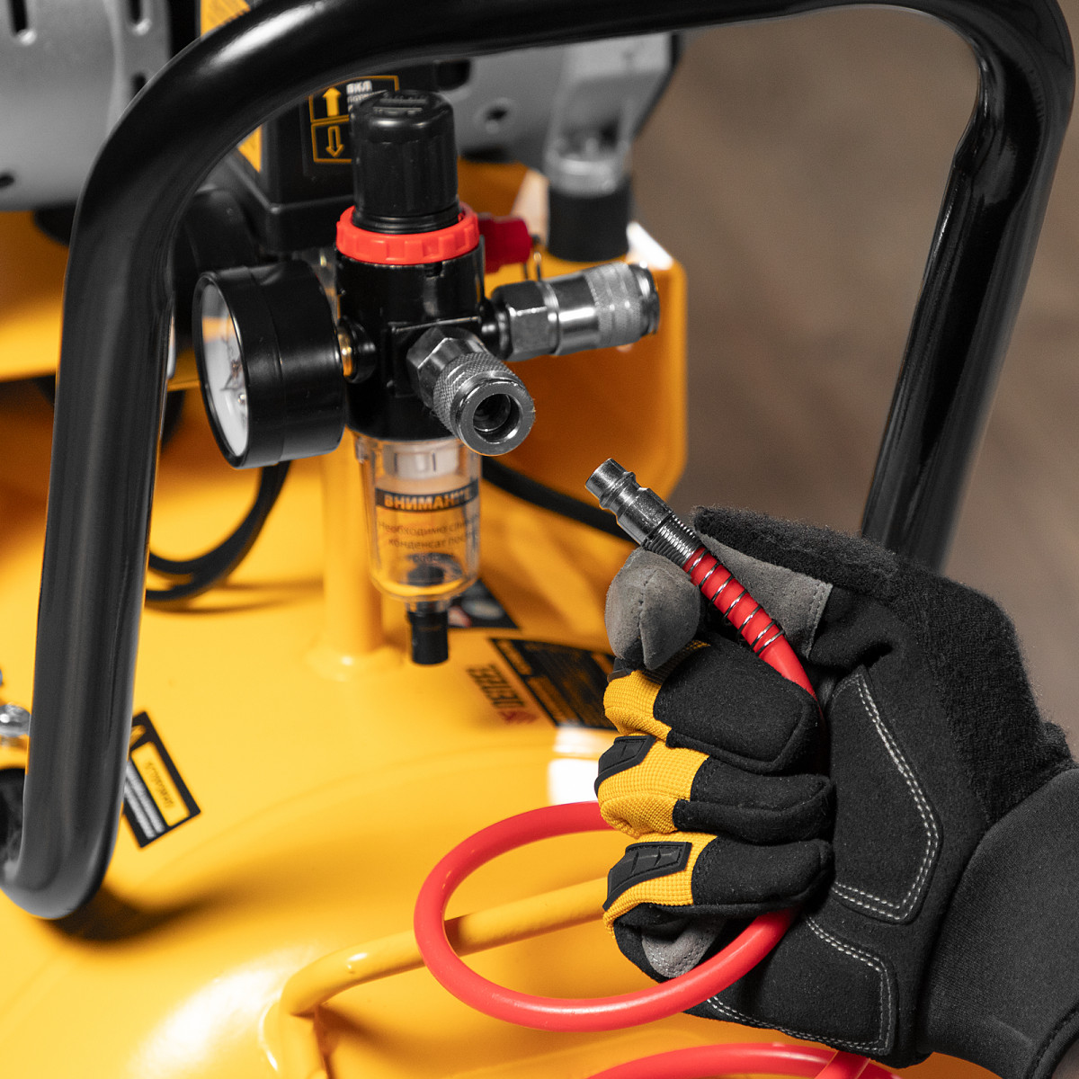 • Простая подготовка к работе — благодаря быстросъемному выходному коннектору подключение пневмоинструмента занимает несколько секунд.