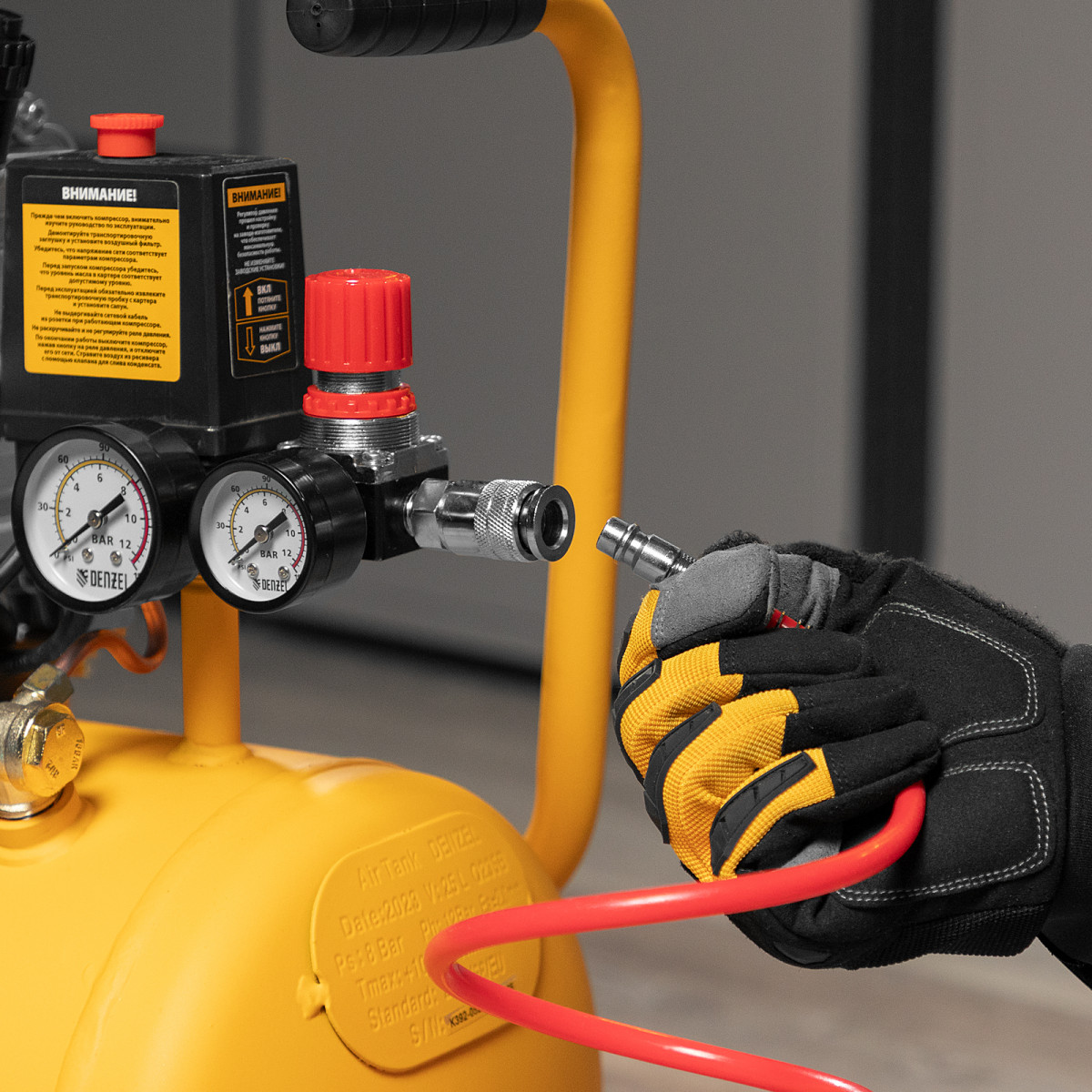 Воздушный компрессор с прямым приводом Denzel DC1500/24 58160 мощностью 1,5 кВт и производительностью на входе 220 л/мин, с объемом ресивера 24 л обеспечивает подачу сжатого воздуха к пневмоинструменту — пневмогайковерту, пневмошлифмашине, пневмодрели. Эффективная система смазки, снижающая нагрузку на двигатель, позволяет использовать компрессор для долговременных работ. Поэтому он будет полезен не только в загородном доме, но и в мастерской или гараже.