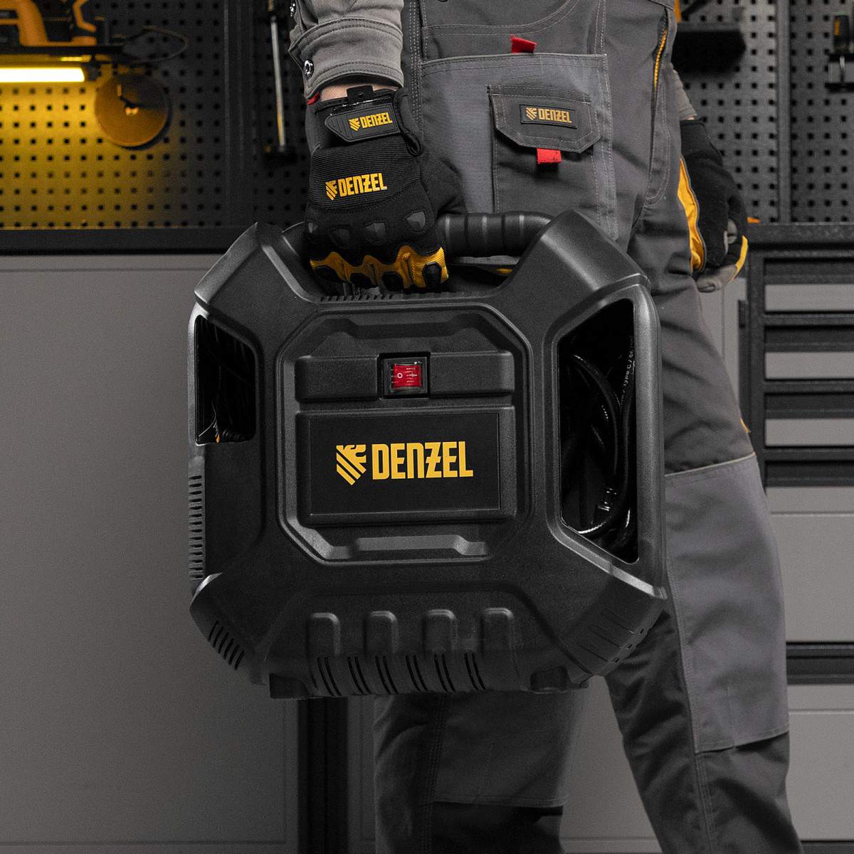 - Легкость перемещения — ребристая транспортировочная ручка делает переноску кейса-компрессора простой и удобной.