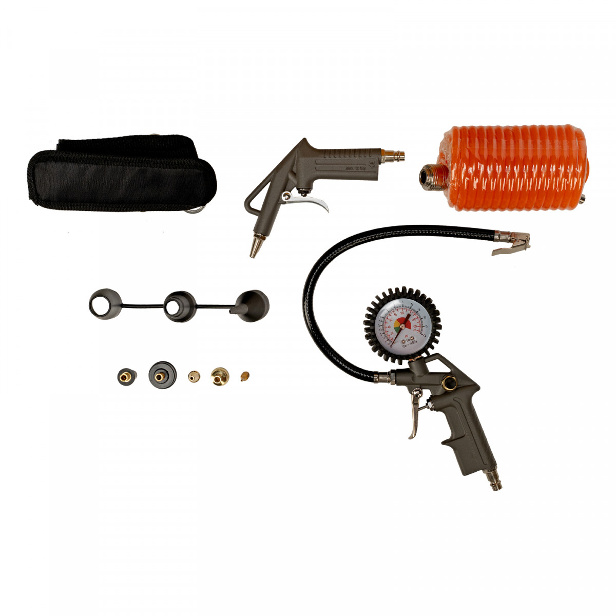 • Набор пневмоинструмента в комплекте — к устройству прилагается пистолет для накачивания с манометром, продувочный пистолет, пневматический шланг, а также набор пневмосопел и переходников.