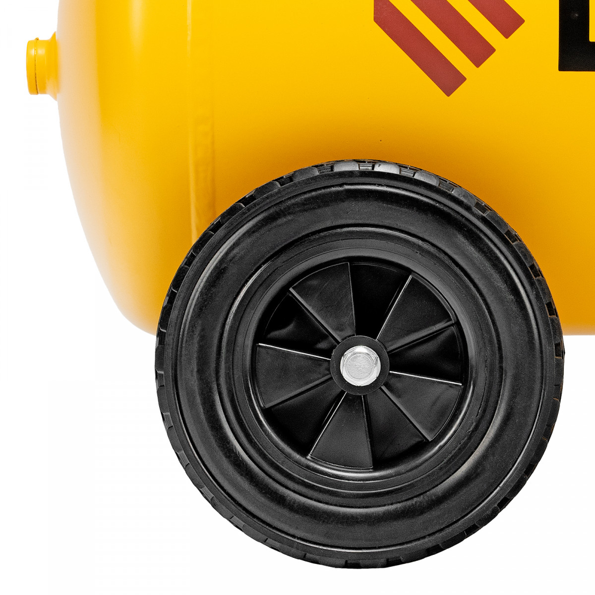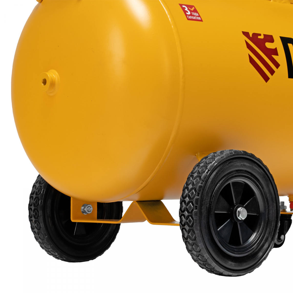 - Удобная транспортировка — на компрессоре установлены колеса, в т. ч. поворотные, и П-образная рукоятка.