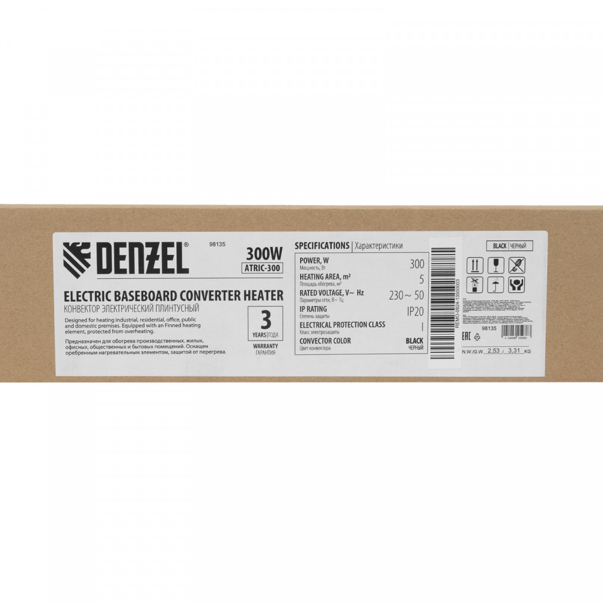 Электрический плинтусный конвектор Denzel ATRIC-300B 98135 черного цвета, мощностью 300 Вт, работает от сети 230 В и предназначен для обогрева закрытых помещений при помощи трубчатого нагревательного элемента (ТЭН). Площадь обогрева составляет 5 м2. Оребренный нагревательный элемент обеспечивает увеличенную площадь контакта с окружающей средой, что повышает скорость нагрева воздуха. Конвектор пригодится в квартире, офисе и на производстве.