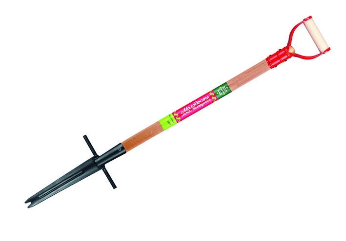 Корнеудалитель БЦМ 1907-ч. Ребро жесткости для прочности конструкции. Упор под ногу – для дополнительного усилия. Рабочая часть из стали. Толщина рабочей части - 3мм. Защитное покрытие рабочей части порошковой краской. Черенок из древесины высшего качества. Длина 94см. Длина металлической части 31см.