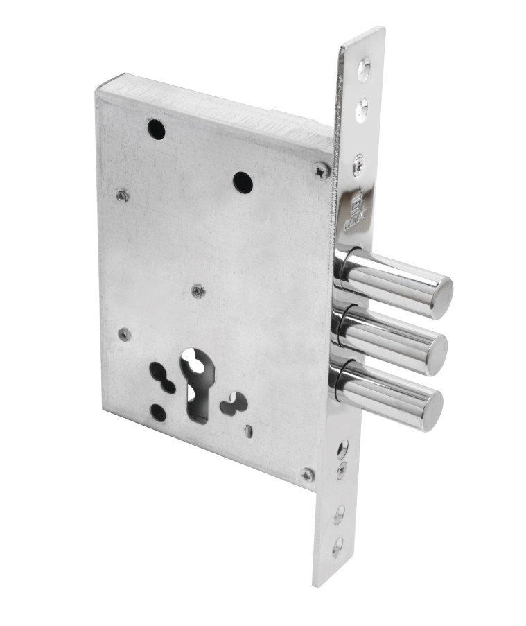 Корпус врезного цилиндрового замка Булат с тремя ригелями предназначен для установки во входные металлические двери. Стальной оцинкованный корпус. Универсальная установка, подходит для левых и правых дверей. Бэксет- 60мм. Выход ригелей- 36мм. Диаметр ригелей -16мм. Открывание-3 полуоборота. В комплект входят: крепежная фурнитура. Цвет лицевой планки- хром