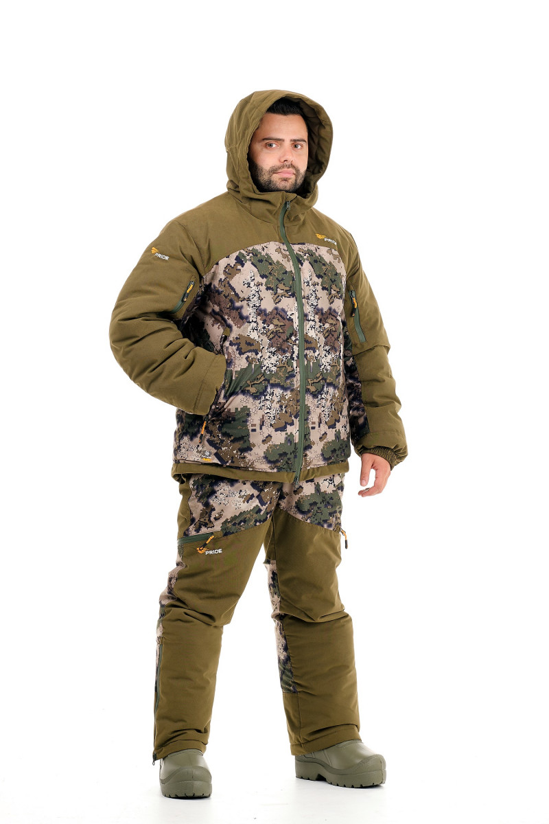 Зимний костюм «Кобра» (ТМ PRIDE) сконструирован специально для ходовой охоты. Комфортный температурный режим минус 20 градусов, температура экстрим минус 45 градусов. Для пошива этого костюма использовалась бесшумна ткань алова и специальные влагозащищенные нити COATS, препятствующие проникновению влаги в швах изделия. Все наружные молнии костюма влагозащищенные. Прямого кроя куртка застегивается на молнию с двумя бегунками, внутренней ветрозащитной планкой. Капюшон с небольшим козырьком не отстегивается, регулируется по овалу лица и по объему утопленными в специальные складки фиксаторами. Карманы утеплены вельбоа, молнии карманов в тон основной ткани.