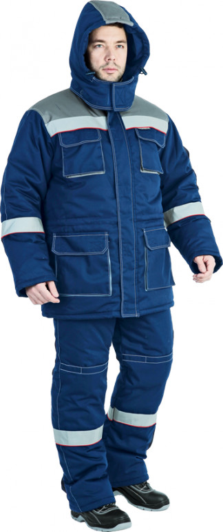 Костюм состоит из куртки и полукомбинезона. В костюме используется ветрозащитная ткань и светоотражающая лента (СОП) 50 мм. Куртка прямого силуэта Центральная застёжка на 2-х замковую молнию и ветрозащитный клапан на ленте — контакт; Дополнительная внутренняя ветрозащитная планка; Воротник — стойка; Съёмный капюшон с регулировкой объёма; Кулисы по линии талии и по линии низа; Накладными объёмными карманами с клапанами на ленту — контакт; Рукав двухшовный с внутренней трикотажной манжетой. Полукомбинезон застёжка на двух замковую молнию; Отрезной нагрудник; Объём спинки регулируется по линии талии эластичной лентой; Бретели на эластичной ленте на фастексы; Боковые накладные карманы с наклонным входом; Наколенниками с отверстиями под амортизационные накладки. Ткань: СТ-2, пл. 240 г/м²,35%ХБ 65%ПЭ Утеплитель: Синтотекс, куртка 4 слоя, пл. 480 г/м2, полукоибмнезон -3 слоя, пл. 360 г/м2 Подкладка: 100% ХБ ГОСТ Р 12.4.236-2011