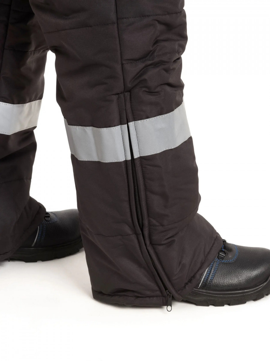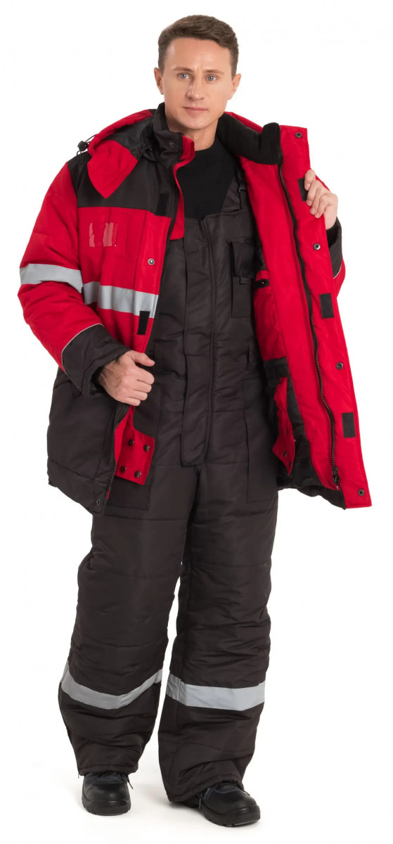 Костюм состоит из куртки и полукомбинезона. Куртка со светоотражающими полосами и кантом, с центральной застежкой на молнию, ветрозащитным клапаном на текстильную застежку с чередованием кнопок и внутреннюю планку с уголком для защиты подбородочной части от молнии. Воротник стойка, с внутренней стороны флис, съемный утепленный капюшон. На правой полочке нагрудный карман для бейджа. Рукава с внутренними трикотажными манжетами. Полукомбинезон со светоотражающими полосами , с центральной застежкой на молнию и планку на текстильную застежку, на регулируемых по длине бретелях. На правой передней половинке нагрудный карман для сотового телефона. Состав: 100% полиэстер Ткань: Taslan 228 Milky PU, пл.135 г. Ткань из 100% нейлона с нанесением полиуретанового покрытия Подкладка: Таффета 190Т Утеплитель куртка - синтепон 2 слоя по 150 г., Termofinn 150г.; полукомбез - синтепон 150 г., Termofinn 150г. Защита 3 класс защиты, lV и особый климатический пояс ГОСТ Р 12.4.236-2011