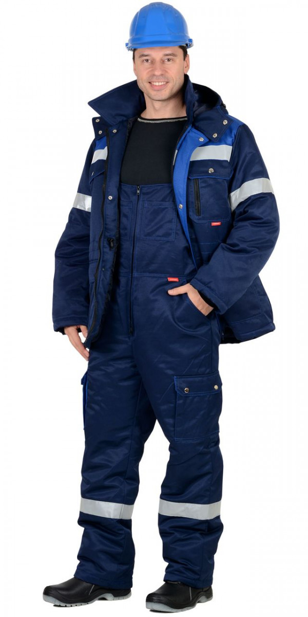 Костюм состоит из куртки и полукомбинезона.Куртка длинная прямого силуэта; с притачной утепленной подкладкой, с центральной застежкой на молнию, с ветрозащитным клапаном, отложным воротником, с верхним накладным фигурным карманом на левой полочке и с верхним прорезным карманом на правой полочке, нижними накладными полуобъемными карманами с фигурным клапаном, застегивающимся на кнопку; с кулисой по линии талии. Полукомбинезон прямой; с притачной утепленной подкладкой, с регулируемыми за счет пряжек - бретелями; с притачным нагрудником; с центральной застежкой на молнию, с нагрудными накладными карманами, с двумя боковыми внутренними карманами, с наклонным входом, с двумя нижними накладными карманами.В костюме предусмотрен СОП ш.50мм для обеспечения сигнальной видимости в условиях пониженной видимости.