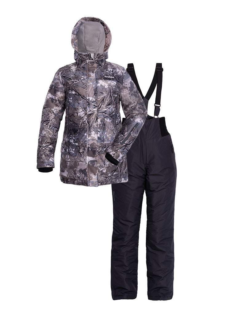 Костюм состоит из куртки и брюк. Разработан в коллекции ТМ «Росомаха» для охоты. Конструкция и внешний вид костюма позволяет использовать его в повседневной носке и для выезда на природу в зимнее время. Температурный режим: до -30°С. Куртка удлиненная, прямого силуэта, умеренного объема. Центральная застежка на «молнии», прикрытой планкой, застегивающейся на кнопки. Втачной капюшон-труба, с регулировкой по объему и глубине. В верхней части полочки расположены вертикальные прорезные карманы на «молнии». в левом кармане карабин на тесьме для крепления мелочей. В нижней части прорезные карманы с клапаном на магнитной кнопке. Брюки умеренного объема, прямые к низу, с отстегивающимися, регулируемыми помочами Застежка гульфика на кнопку и «молнии» Регулировка пояса по талии осуществляется с помощью эластичной резинки и широких трикотажных вставок. В верхней части по бокам брюк расположены прорезные карманы на «молнии».