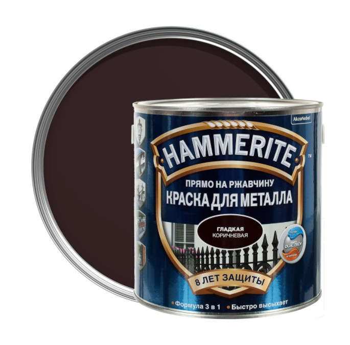 Краска Hammerite гладкая коричневая 2,2лпо металлу прямо на ржавчину 3в1