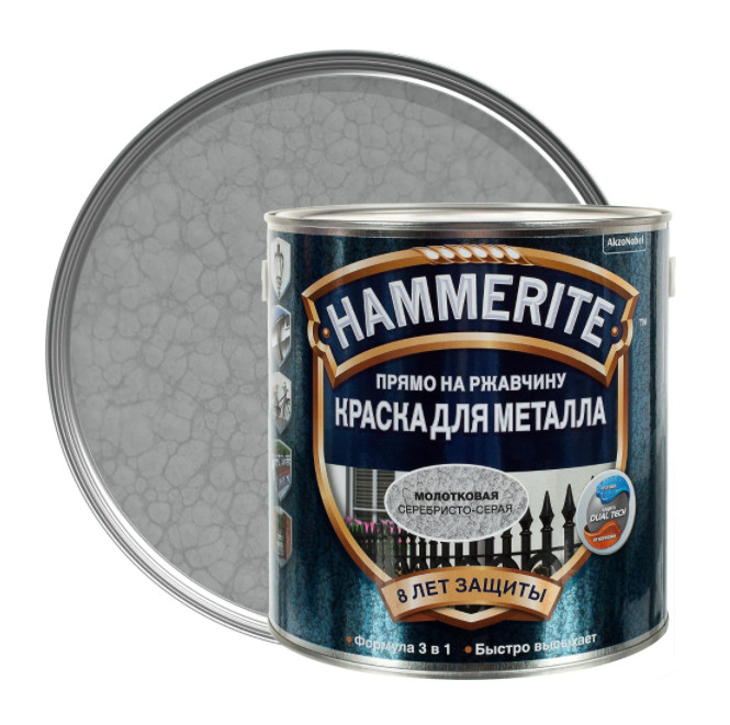 Краска для металла молотковая Hammerite (серебристо-серый цвет) — защитное покрытие для черных металлов, наносимое непосредственно на пораженную ржавчиной поверхность. В составе — антикоррозионные добавки и преобразователи ржавчины. Готовое покрытие имеет декоративный вид с визуальным эффектом ручной чеканки по металлу. Эффект создается за счет наполнителей из алюминиевой крошки и силиконовых добавок.