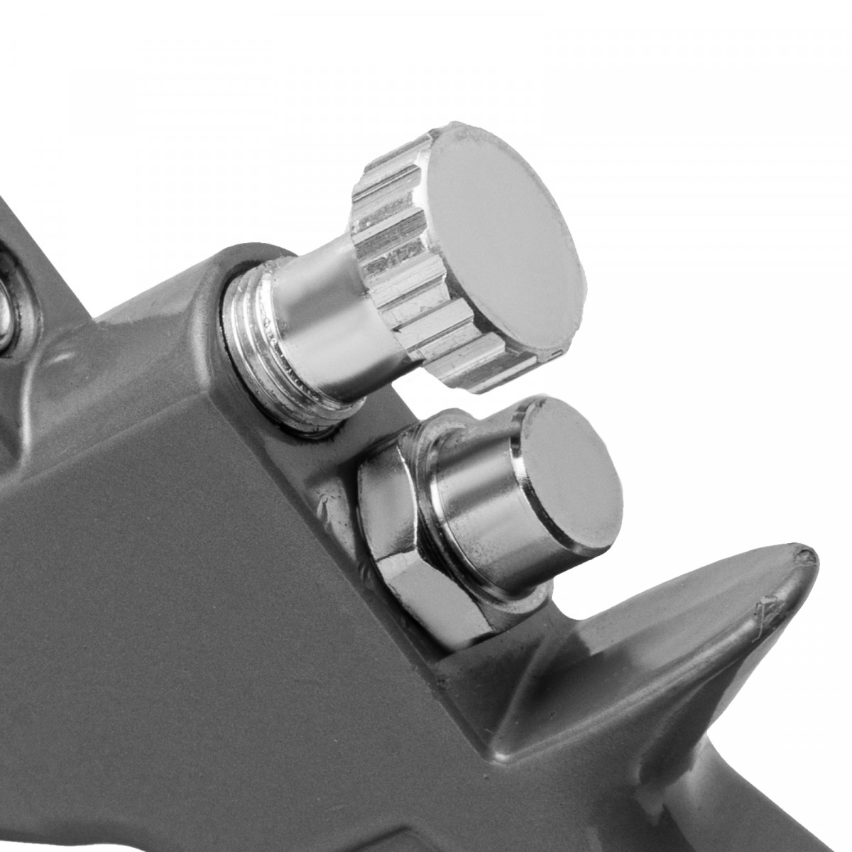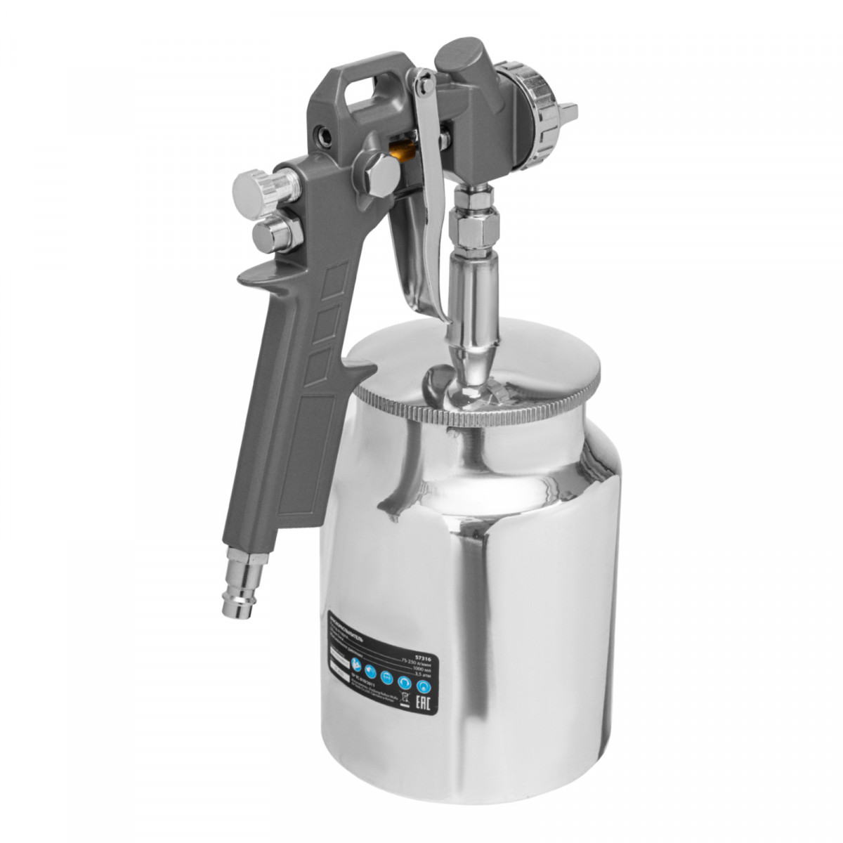 • Нижнее расположение бака — краскораспылитель можно ставить на горизонтальные поверхности, также он не загораживает обзор в процессе работы.