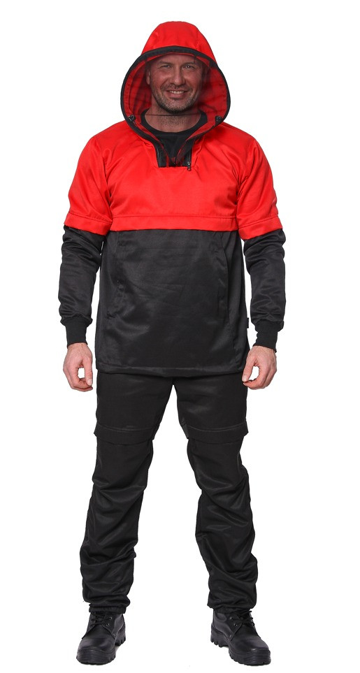 Куртка: - анорак (без распашной застежки), спереди один большой накладной карман с двумя входами по бокам, входы выполнены с помощью листочек и застегиваются на липу. Капюшон не отстегивается, имеет регулировку в средней части хлястиком на липе по высоте и утягивается шнуром по лицевому краю. Есть защитная сетка на лицо, можно отстегнуть и убрать в потайной карман. Низ рукавов с трикотажными манжетами по запястью. Имеются ловушки на рукавах и в области груди. Гиз куртки утягивается шляпной резинкой с двух сторон.верх: смесовая гретта