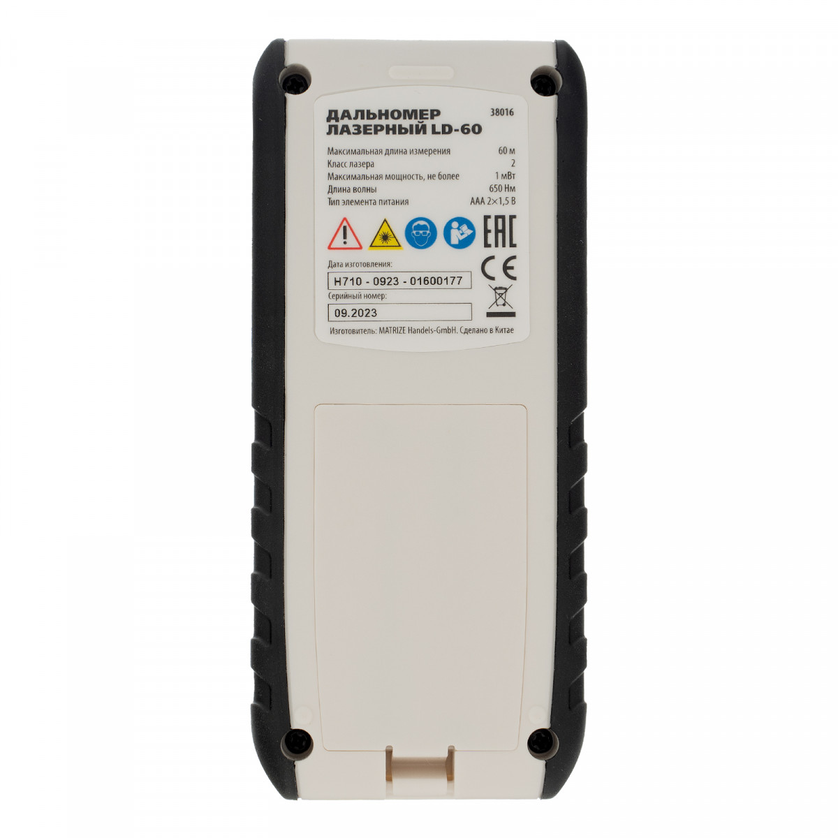 Лазерный дальномер Matrix LD-60 38016 с электронным угломером позволяет измерять длину на расстоянии от 0,05 до 60 м, вычислять площадь и объем помещения, а также измерять углы. Функция складывания и вычитания полученных результатов существенно облегчает и ускоряет работу. Дальномер будет полезен для выполнения работ по укладке плитки, установке натяжных потолков и напольных конструкций, монтаже окон и дверей, проектированию пространства.