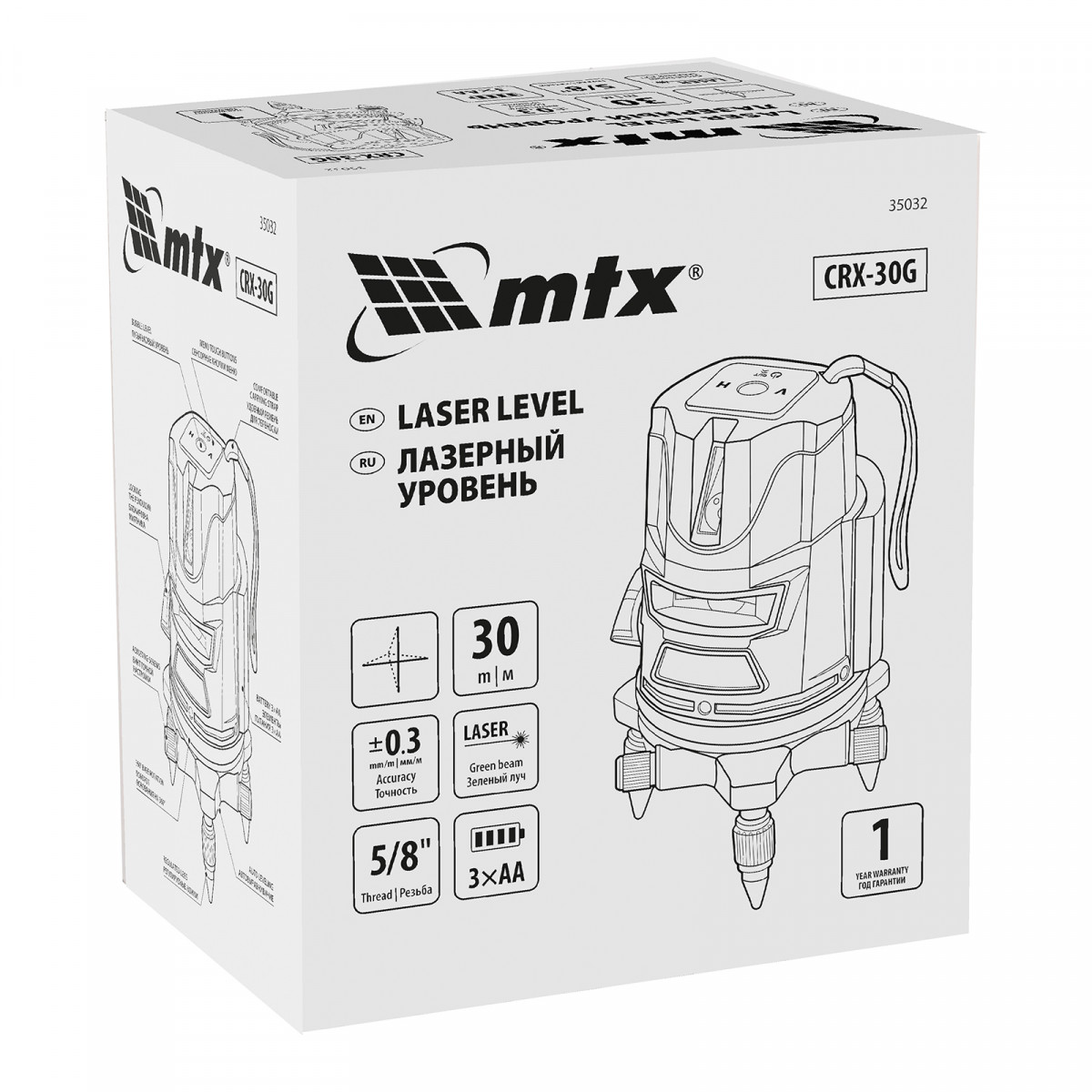 Лазерный уровень CRX-30G, 30 м, зеленый луч, батарейки, резьба 5/8" MTX
