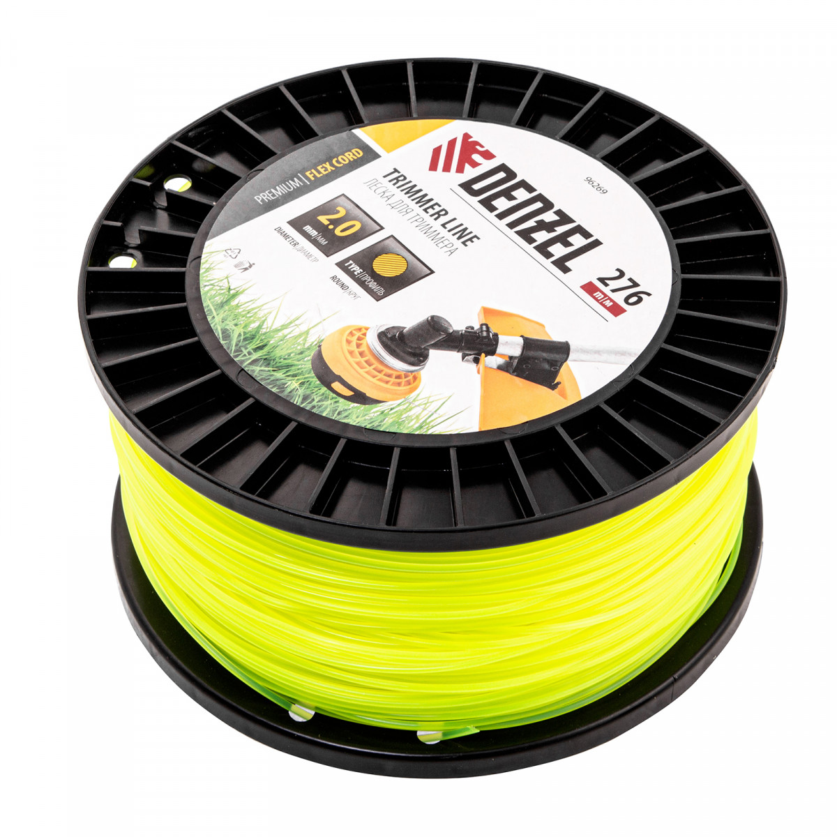 Леска для триммера Denzel FLEX CORD 96269 круглого сечения, диаметром 2,0 мм и длиной 276 м, на DIN-катушке, предназначена для скашивания мягкой, молодой травы. Подходит для бензиновых триммеров с объемом двигателя 25-52 см3 и электрических триммеров мощностью от 1 до 1,5 кВт.