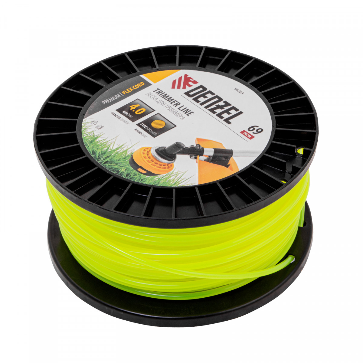 Леска для триммера Denzel FLEX CORD 96283 круглого сечения, диаметром 4,0 мм и длиной 69 м, на DIN-катушке, предназначена для скашивания как мягкой, молодой травы, так и густой растительности, бурьяна. Подходит для бензиновых триммеров с объемом двигателя более 25-52 см3.