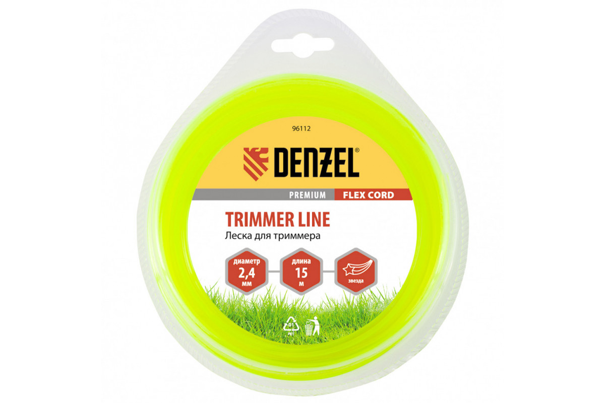 Леска Denzel FLEX CORD 96112 с сечением «звезда», диаметром 2,4 мм и длиной 15 м, поставляется в блистере и используется для бензиновых и электрических триммеров мощностью 1-1,4 кВт. Предназначена для стрижки жесткой травы, борьбы с дикой порослью и сорняками с толстыми стеблями.