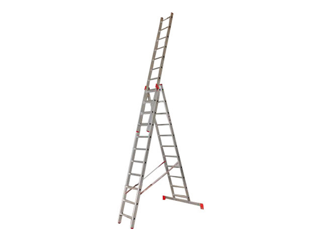 Профессиональная алюминиевая трехсекционная лестница выдержит большие нагрузки благодаря уникальной конструкции рамы, широкой траверсе, которая обеспечивает устойчивость всей конструкции. Специальный рельеф ступеней препятствует скольжению при использовании лестницы. Лестница снабжена самозахватывающими фиксирующими крюками, которые препятствуют самопроизвольному рассоединению секций.Особенности: