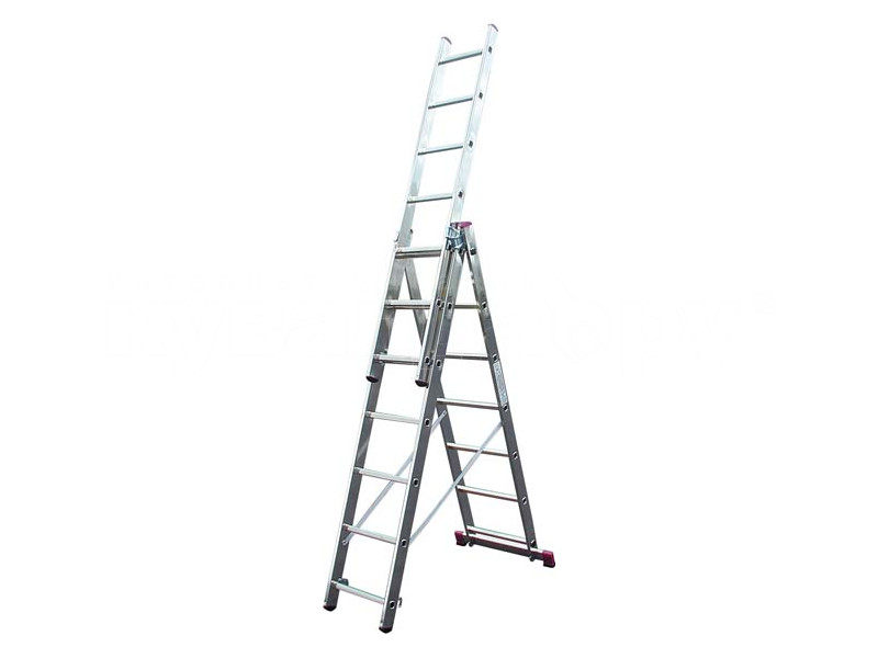 Профессиональная алюминиевая трехсекционная лестница выдержит большие нагрузки благодаря уникальной конструкции рамы, широкой траверсе, которая обеспечивает устойчивость всей конструкции. Специальный рельеф ступеней препятствует скольжению при использовании лестницы. Лестница снабжена самозахватывающими фиксирующими крюками, которые препятствуют самопроизвольному рассоединению секций.