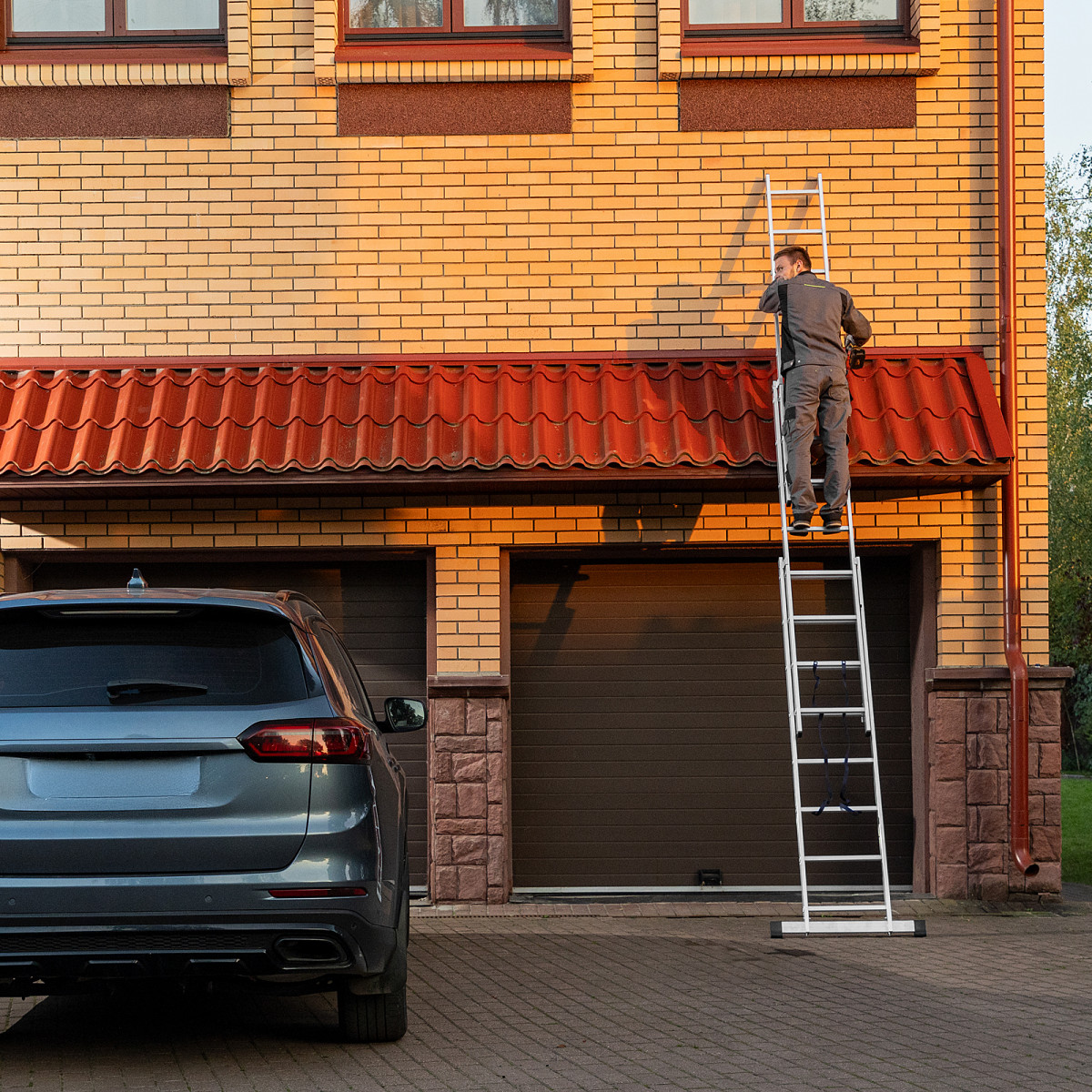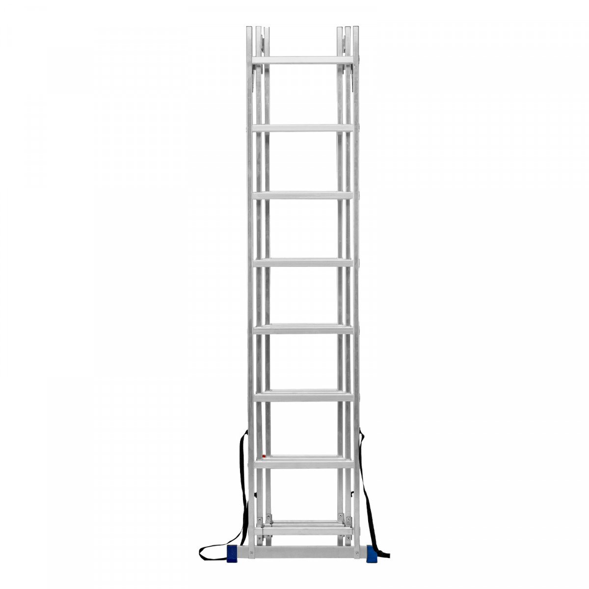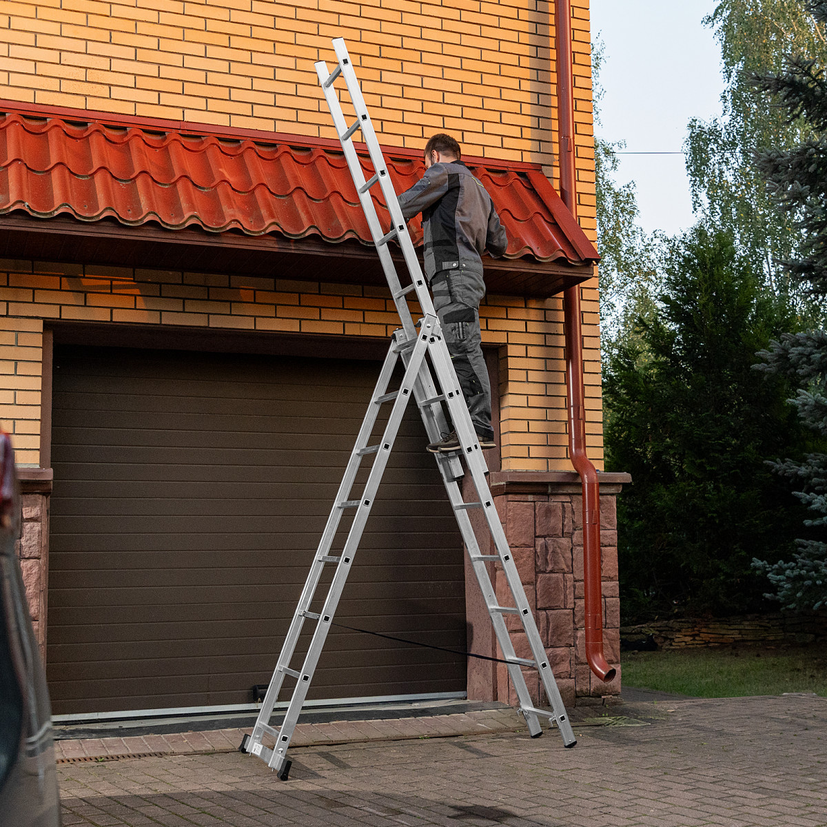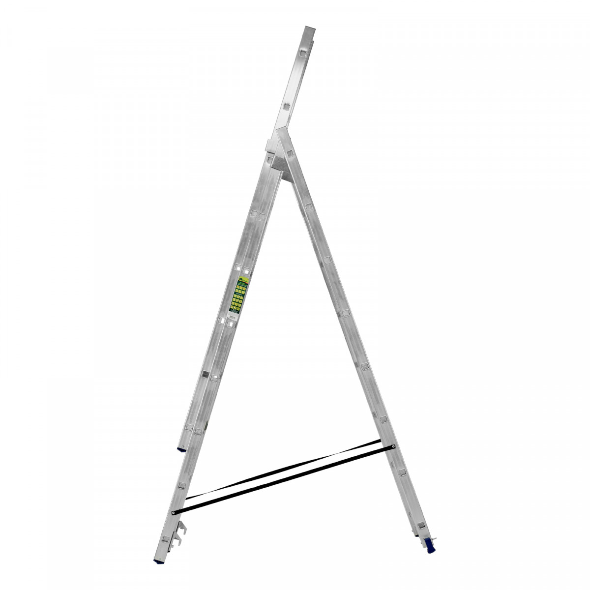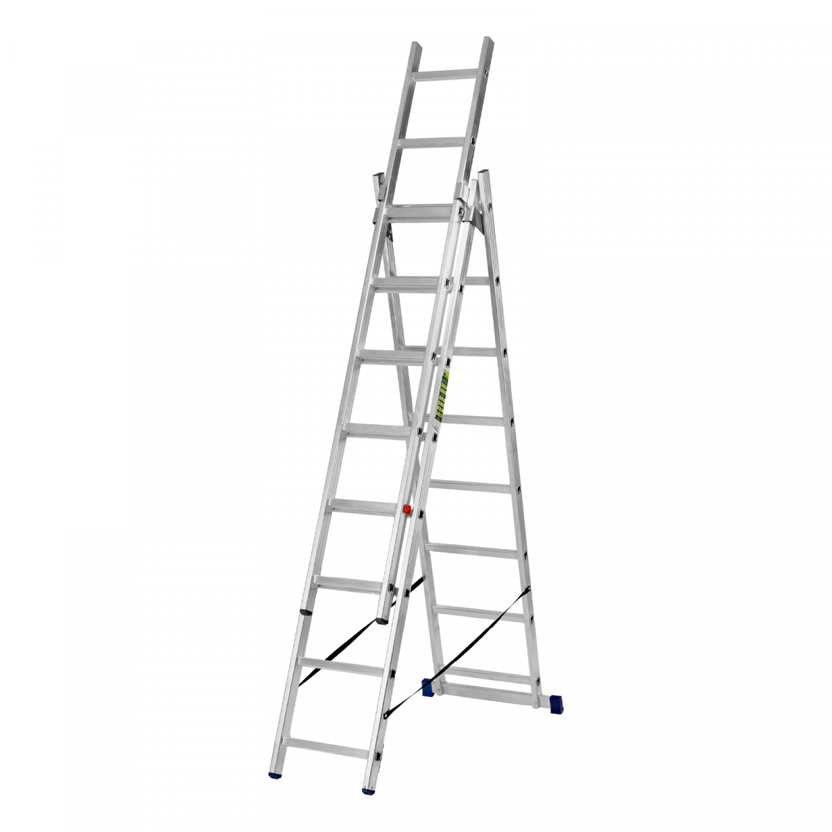 • Многофункциональность — лестница может использоваться в 3 различных вариациях — в качестве стремянки (с двумя расставленными и одной выдвинутой вверх секцией), двухсторонней стремянки (две секции расставлены, третья демонтирована) и приставной лестницы.