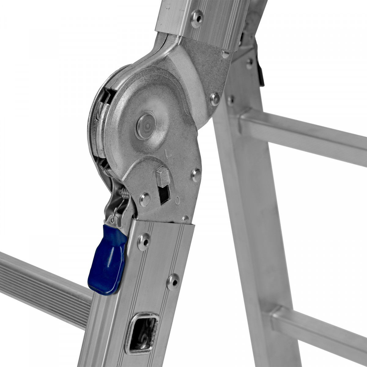 • Надежные шарнирные механизмы — лестница не шатается в рабочих положениях, смена рабочих положений происходит быстро и легко.