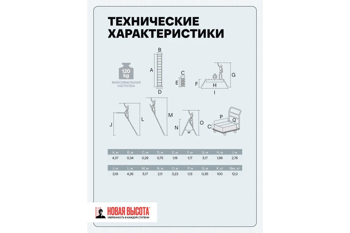 Четырехсекционная лестница-трансформер Новая Высота 4х4 1320404 отличается универсальностью, компактностью при хранении, устойчивостью. Легко преобразуется в помост-платформу, стремянку, приставную лестницу, лестницу с выносом.  Максимально допустимая нагрузка в положении помост 100 кг.