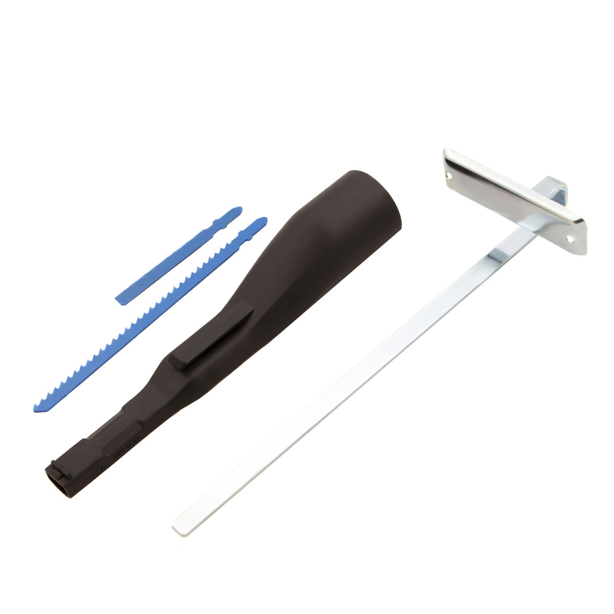 • Полная комплектация — лобзик поставляется с направляющей, пилками по дереву и металлу, шестигранным ключом, адаптером для подключения пылесоса и запасными угольными щетками.