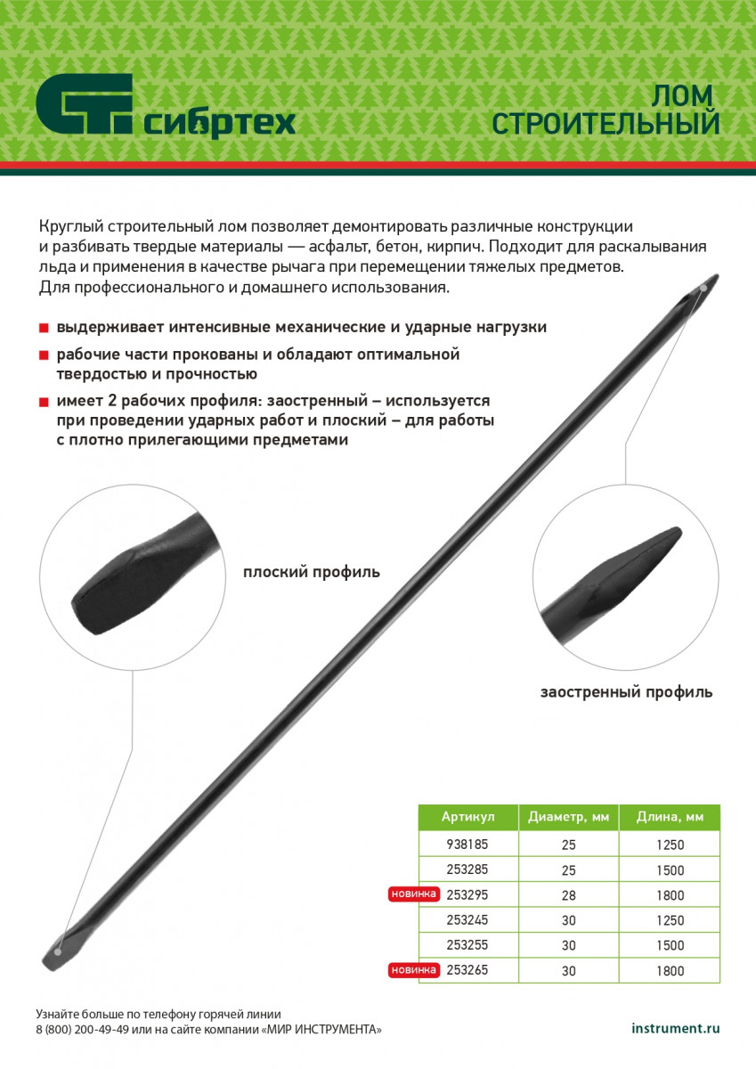 Круглый строительный лом 253255 длиной 1500 мм и диаметром 30 мм позволяет демонтировать различные конструкции и разбивать твердые материалы — асфальт, бетон, кирпич. Подходит для раскалывания льда и применения в качестве рычага при перемещении тяжелых предметов. Инструмент предназначен для профессионального использования, также будет полезен в домашнем хозяйстве.