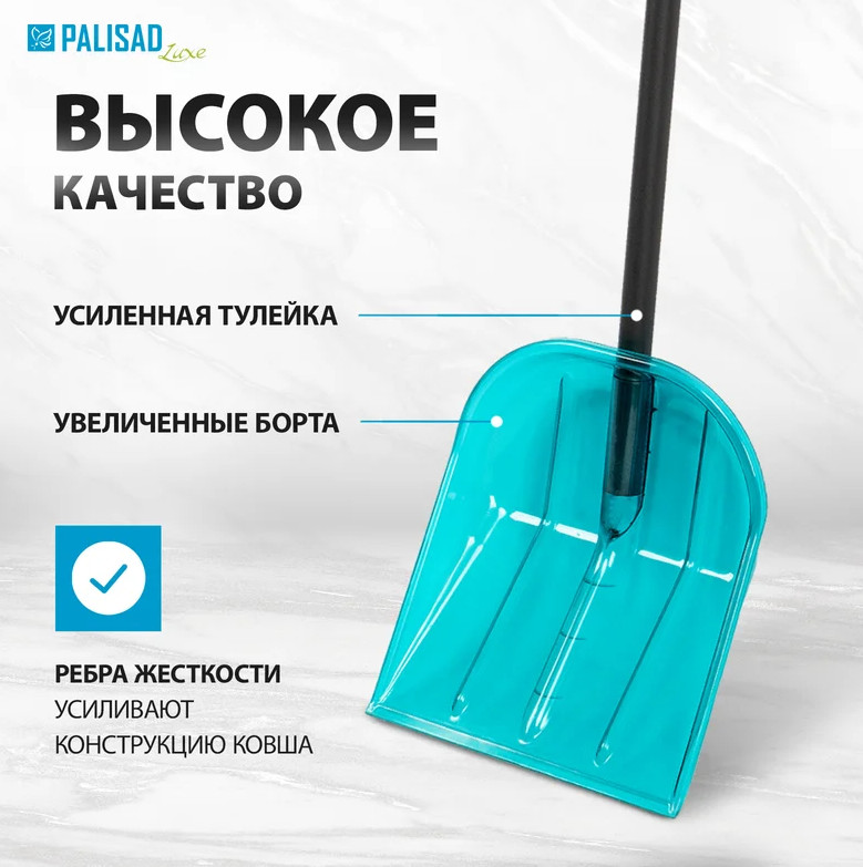 Лопата Palisad LUXE 61691 длиной 1340 мм, с ковшом из поликарбоната размером 340 х 385 мм и алюминиевым черенком, позволяет очистить от снега дорожки на загородном участке, тротуар, выезд из гаража и т.д. Вместительный ковш с увеличенными бортами позволяет убирать снег различной глубины. Благодаря заостренной кромке ковша лопата справляется даже с плотным снегом и наледью.