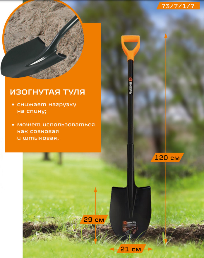 Изогнутая туля снижает нагрузку на спину, может использоваться как совковая лопата.