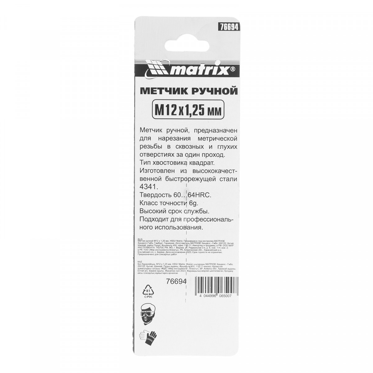 Ручной метчик Matrix 76694, HSS, — резьбонарезной инструмент, который используется для создания резьбы диаметром М12 и шагом 1,25 мм. Оптимален для работы с деталями из твердой стали прочностью до 900 Н/мм². Нарезает резьбу за один проход. Метчик устанавливается на метчикодержатель с патроном под хвостовик 7 мм. Будет полезен в слесарной мастерской, а также дома или в гараже.