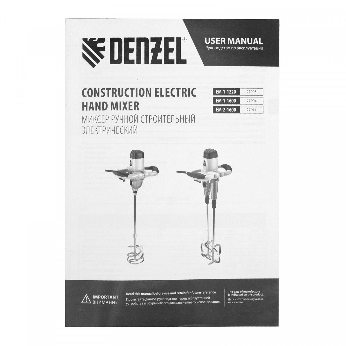 Миксер строительный Denzel EM-2-1600 27911 мощностью 1600 Вт используется в бытовых условиях для приготовления бетонных смесей, облицовочных растворов, клея для плитки и обоев, лакокрасочных материалов на скорости 200-480/250-680 об/мин. Максимальный крутящий момент 90 Н⋅м обеспечивает быстрое и равномерное смешивание растворов разной вязкости. Миксер предназначен для бытового применения.