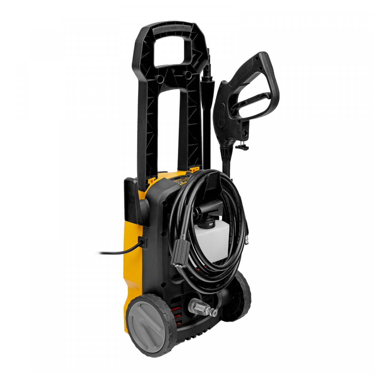 - Продуманная конструкция — кронштейны для шнура питания и шланга высокого давления, а также держатель для пистолета обеспечивают удобство хранения.