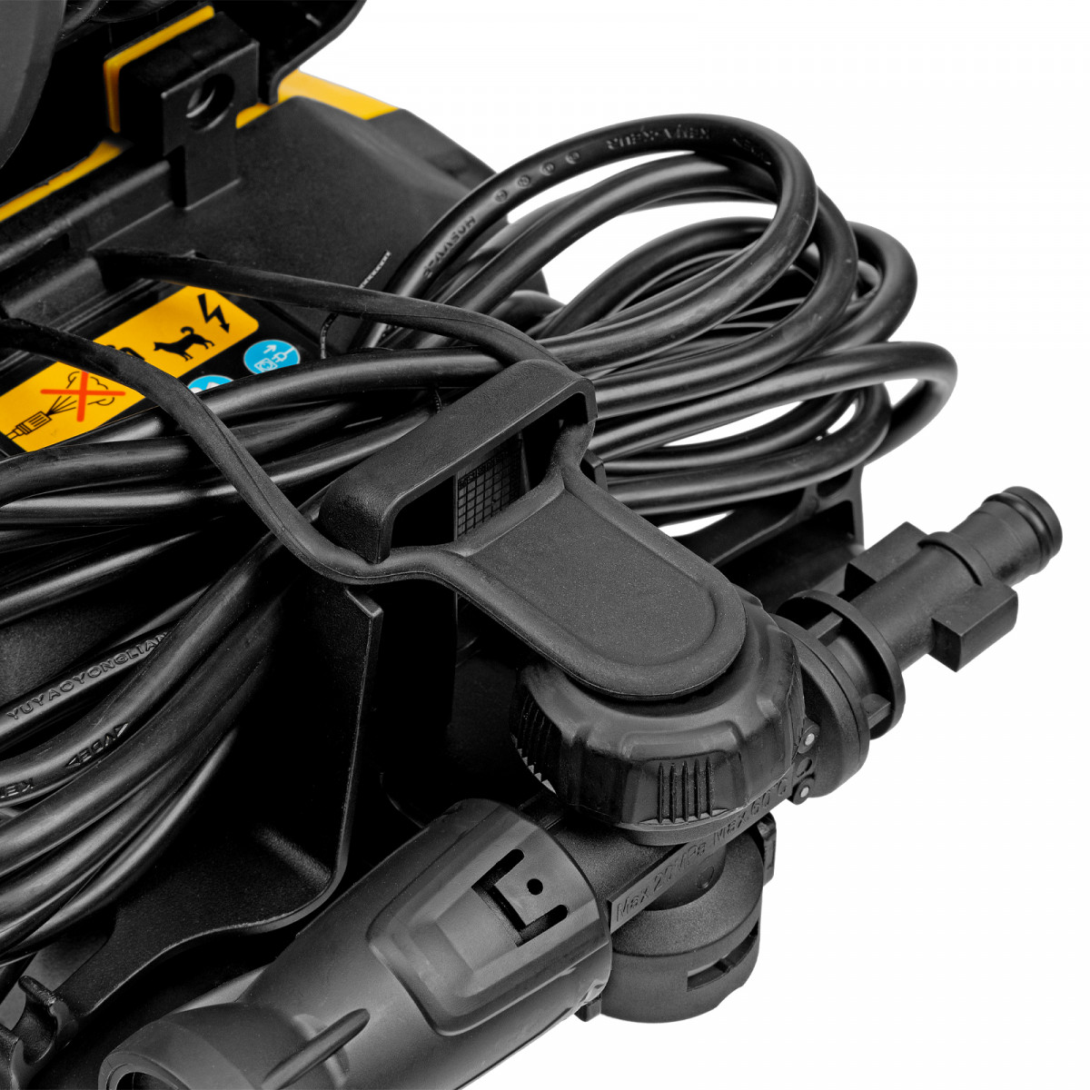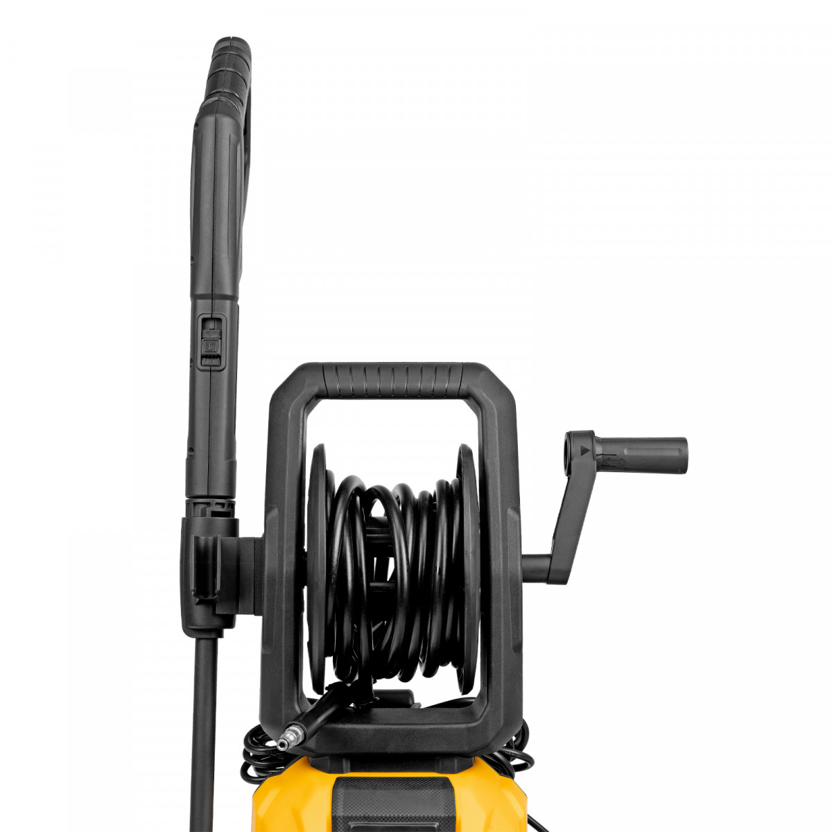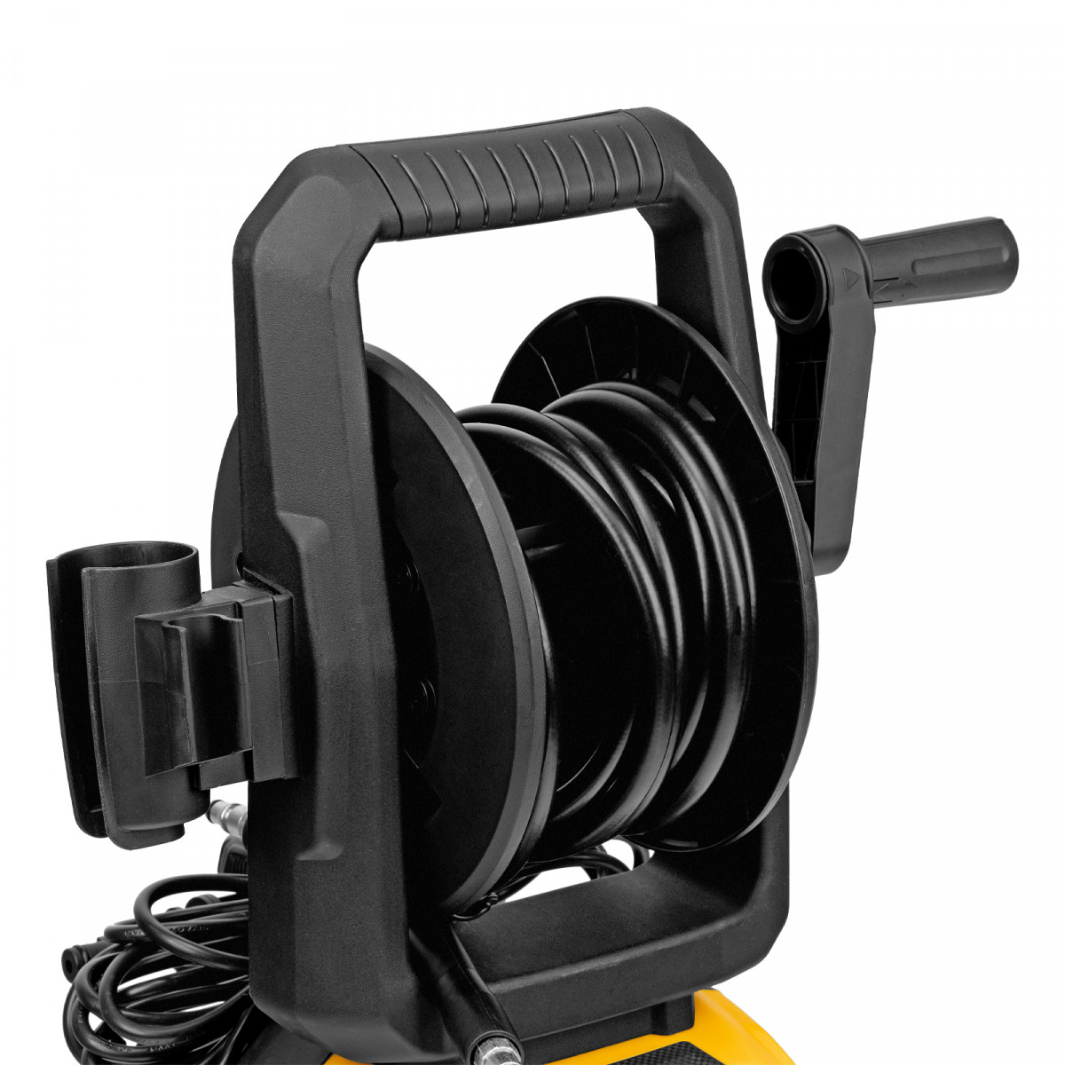 - Комфортная эксплуатация — барабан для шланга высокого давления упрощает работу, длина кабеля и шланга высокого давления составляет 5 м, что позволяет свободно передвигаться по участку.