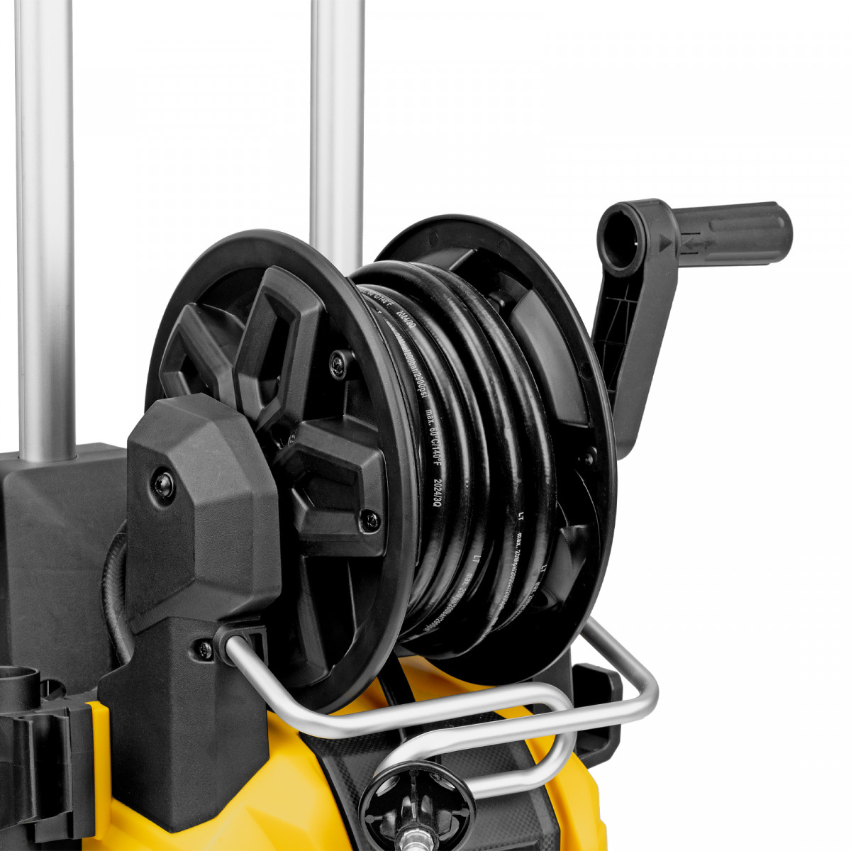 - Удобное использование — функциональный барабан подключен к магистрали высокого давления, поэтому вы можете разматывать и убирать шланг на барабан, не отсоединяя его от мойки.