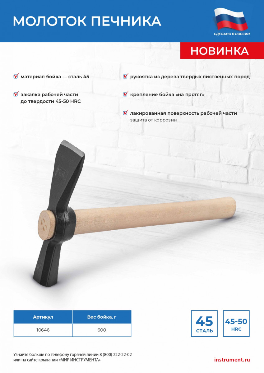 Молоток печника 10646 с деревянной рукояткой, головкой весом 600 г и посадкой бойка на протяг (без клина) — специализированный инструмент для работы с кирпичом и керамическим стеновым камнем. Форма головки обусловлена спецификой области применения — с одной стороны имеется квадратный боек для нанесения ударов, а с другой — плоская лопатка для раскалывания или обтесывания кирпича и камня. Молоток используется в строительном и печном деле.