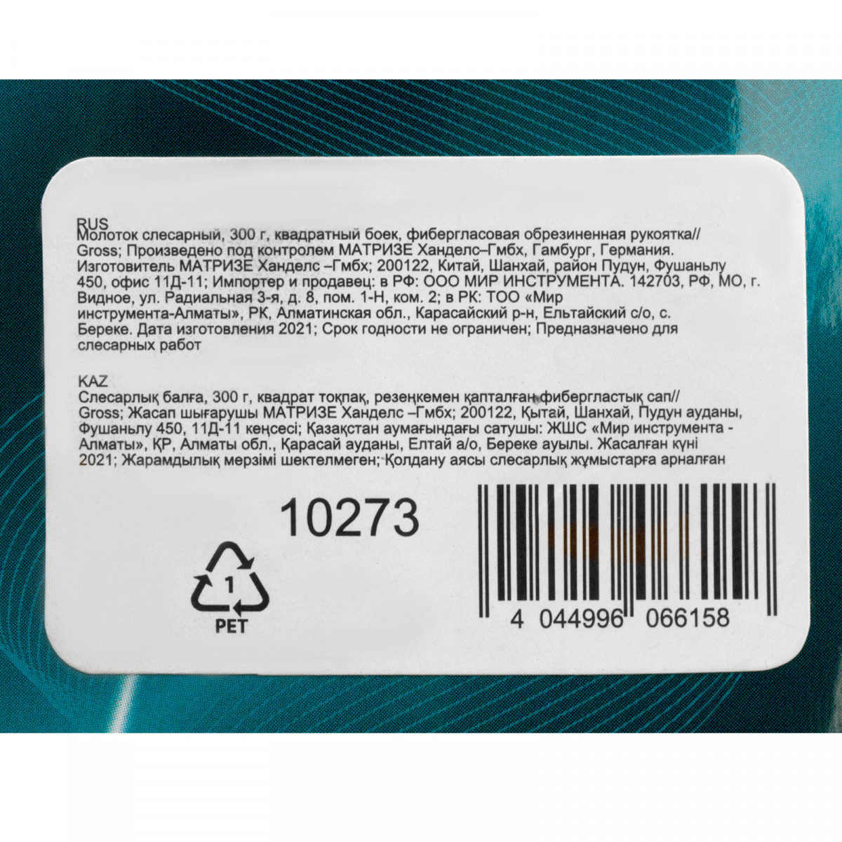Молоток слесарный, 300 г, квадратный боек, фибергласовая обрезиненная рукоятка Gross