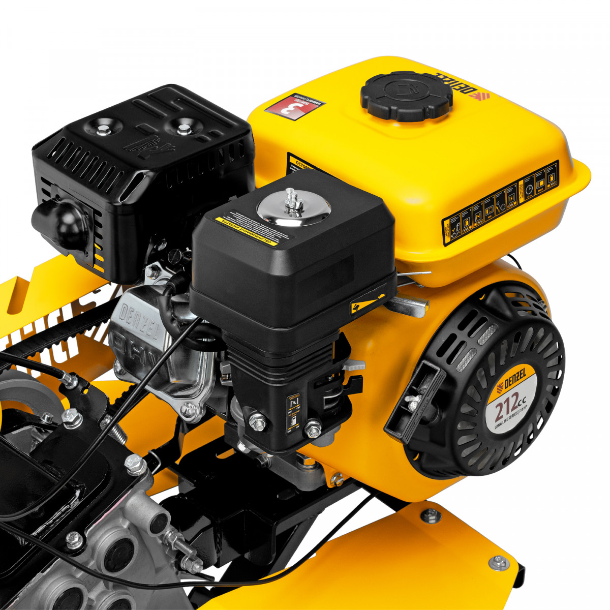 - Надежность — мощный и экономичный 4-тактный OHV-двигатель Denzel Long Life с воздушным охлаждением обеспечивает стабильную работу на протяжении длительного времени.