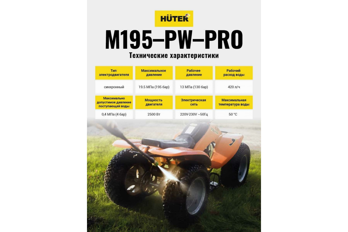 Мойка Huter M195-PW-PRO поможет в решении многих бытовых задач, например, при мытье машины, мотоцикла, садовых дорожек, фасада и двора. Двигатель мощностью 2500 Вт образует струю воды с максимальным рабочим давлением 130 бар. С такой мойкой застарелая и въевшаяся грязь больше не проблема.