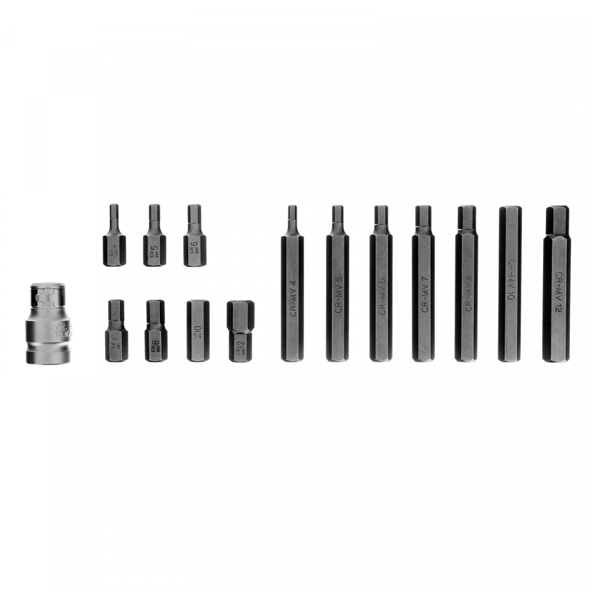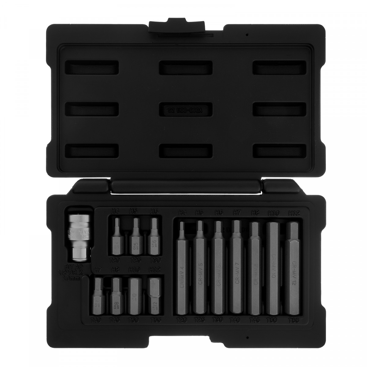 Набор Stels 11313 включает 15 предметов: 14 бит HEX с шестигранным хвостовиком 1/2 дюйма, из стали CrV, и переходник. Переходник позволяет устанавливать биты на ключ-трещотку, пневмогайковерт или пневмотрещотку для монтажа и демонтажа евровинтов со шлицами HEX H4-H12. Набор предназначен для использования в автомастерских и на производстве автомобилей.