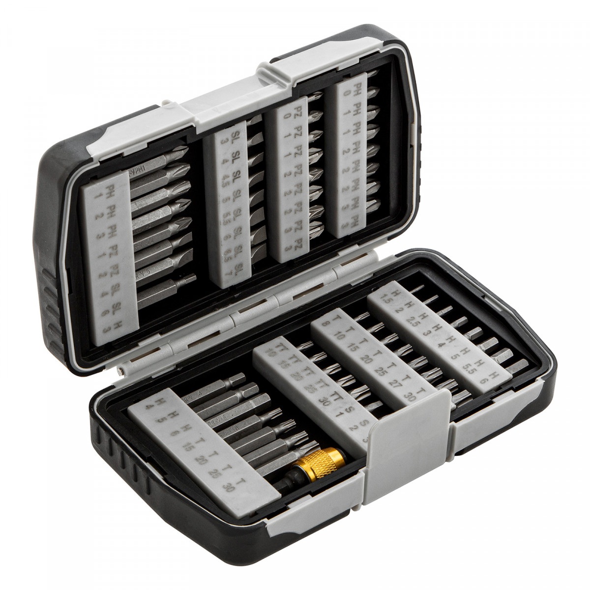 Набор Matrix 11327 состоит из 64 предметов, упакованных в пластиковый бокс, и включает биты из стали CrV и магнитный адаптер. Кроме бит длиной 25 мм в комплект входит 15 насадок длиной 50 мм для работы в труднодоступных местах. Оснастки используются совместно с шуруповертами и отвертками для монтажа и демонтажа резьбовых соединений.
