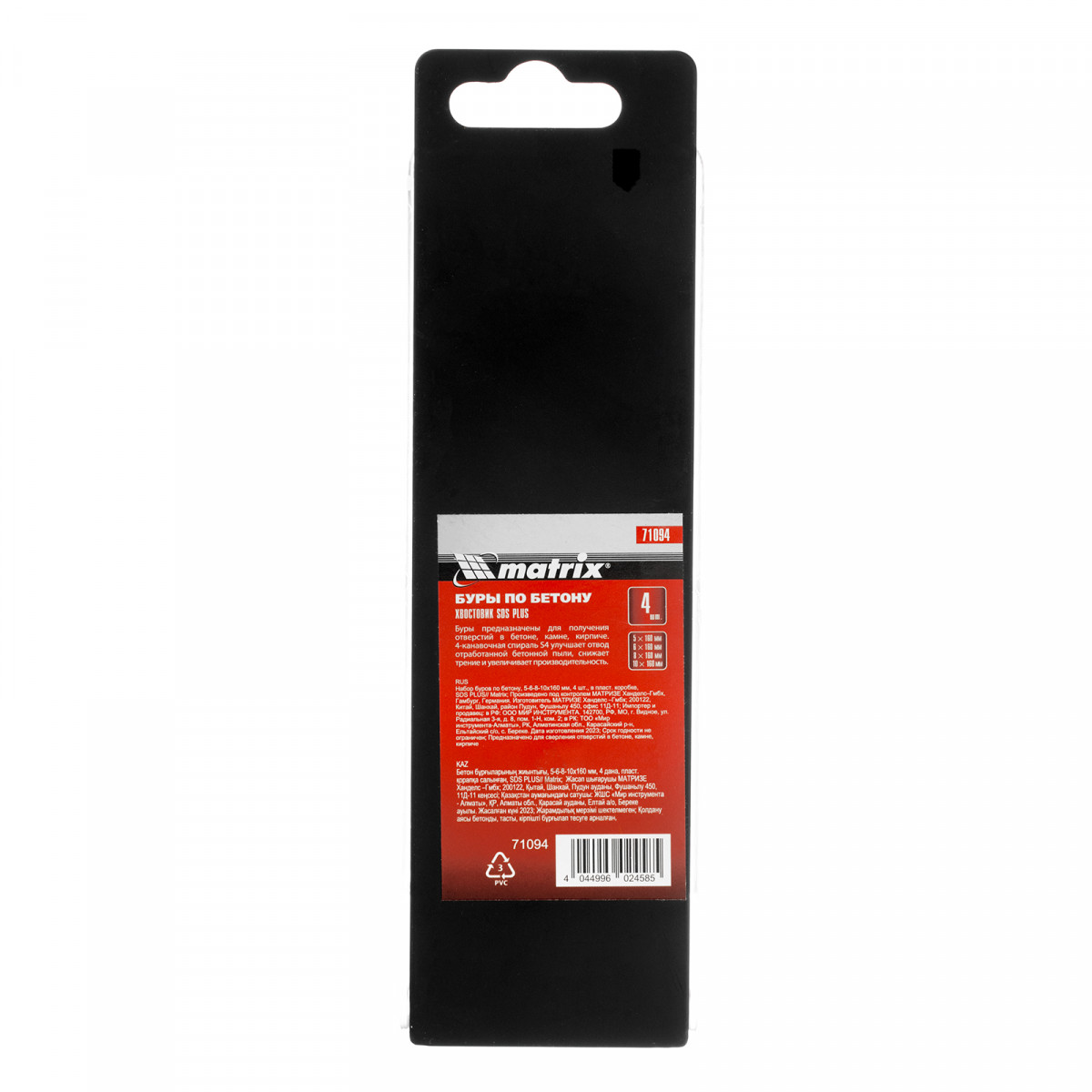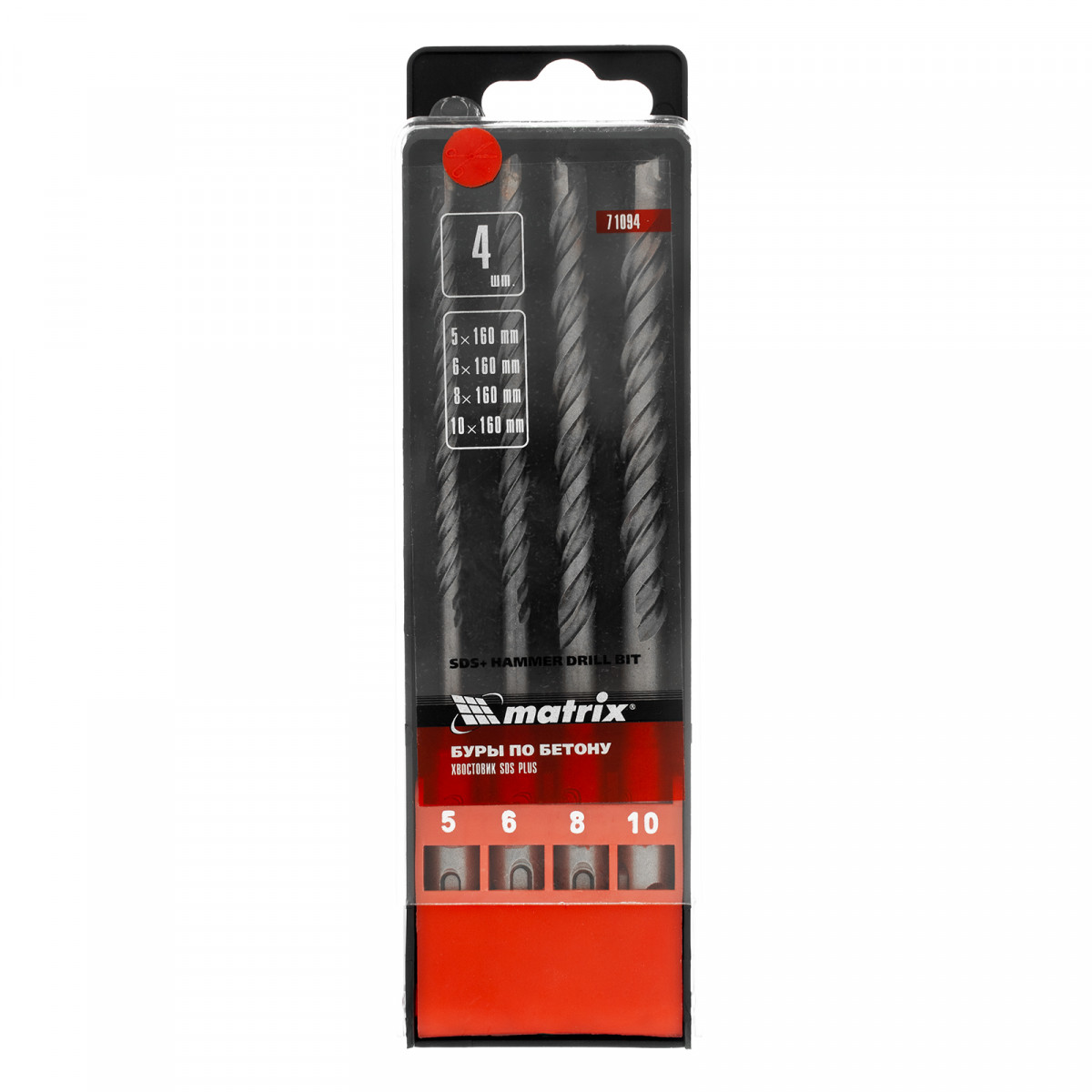 Набор Matrix 71094 состоит из 4 буров по бетону размером 5-6-8-10 х 160 мм, с хвостовиком SDS PLUS, упакованных в пластиковую коробку. Пригодится как начинающим, так и профессиональным мастерам для сверления бетона, кирпича и камня. Применяется при проведении монтажных, демонтажных, ремонтных и строительных работ.