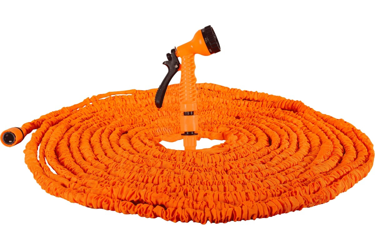 Набор для полива с растягивающимся шлангом подходит для орошения дачных и садовых участков. Комплектуется пистолетом-распылителем с 7 режимами. Шланг из прочного латекса может сжиматься и растягиваться, что удобно при поливе и хранении.