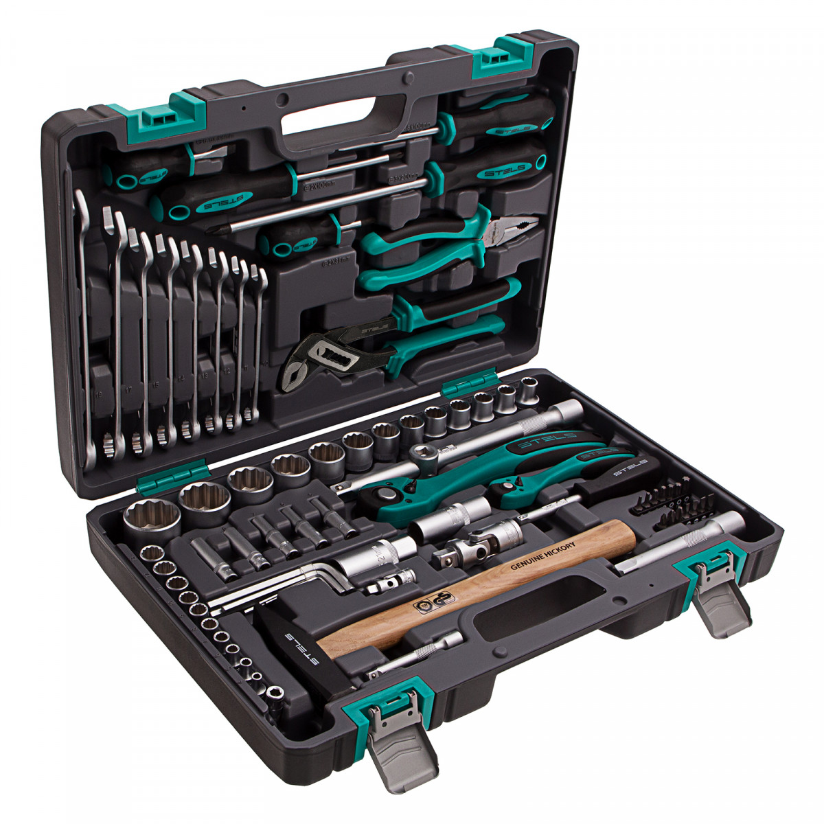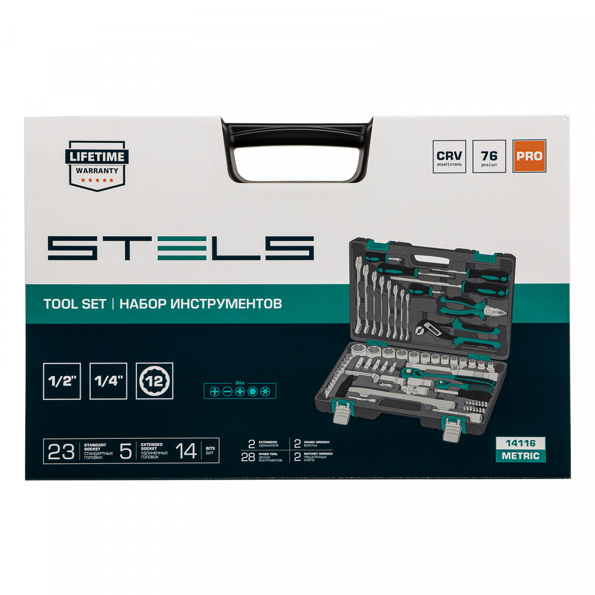 Набор инструментов Stels 14116 в ударопрочным пластиковом кейсе состоит из 76 предметов с присоединительными квадратами 1/2″ и 1/4″, из стали CrV и S2, и предназначен для выполнения слесарно-монтажных работ. Включает инструменты и насадки для работы с резьбовыми крепежами, в том числе 12-гранные торцевые головки и удлинители, облегчающие работу в труднодоступных местах. Молоток, плоскогубцы и переставные клещи расширяют возможности применения набора. Набор предназначен для профессионального использования в автомастерской, будет полезен и для решения бытовых задач.