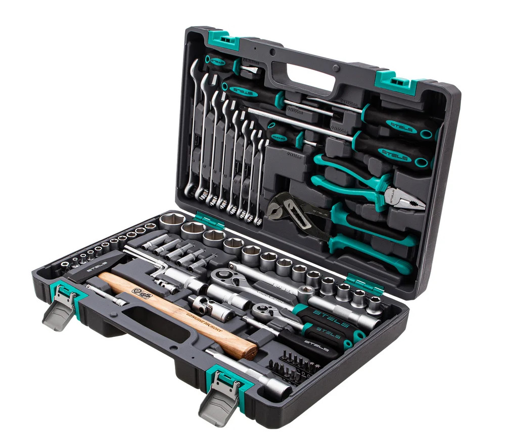 Наборы инструмента торговой марки STELS разработаны специально для автолюбителей и центров технического обслуживания. Каждый этап производства контролируется в соответствии с международными стандартами. Головки и комбинированные ключи изготовлены из хромованадиевой стали, придающей инструменту исключительную твердость в сочетании с легкостью. Биты, биты-вставки и отвёртки производятся из стали S2, улучшающей свойства инструмента. Все наборы упакованы в кейс, изготовленный из жесткого противоударного пластика, с металлическими застёжками. Наборы инструмента STELS пригодятся вам не только в автомобиле. С их помощью можно проводить бытовой ремонт дома и на даче, ремонт бытовых конструкций и садовой техники. Набор инструментов, 1/2", 1/4", CrV, пластиковый кейс 76 предм.// STELS